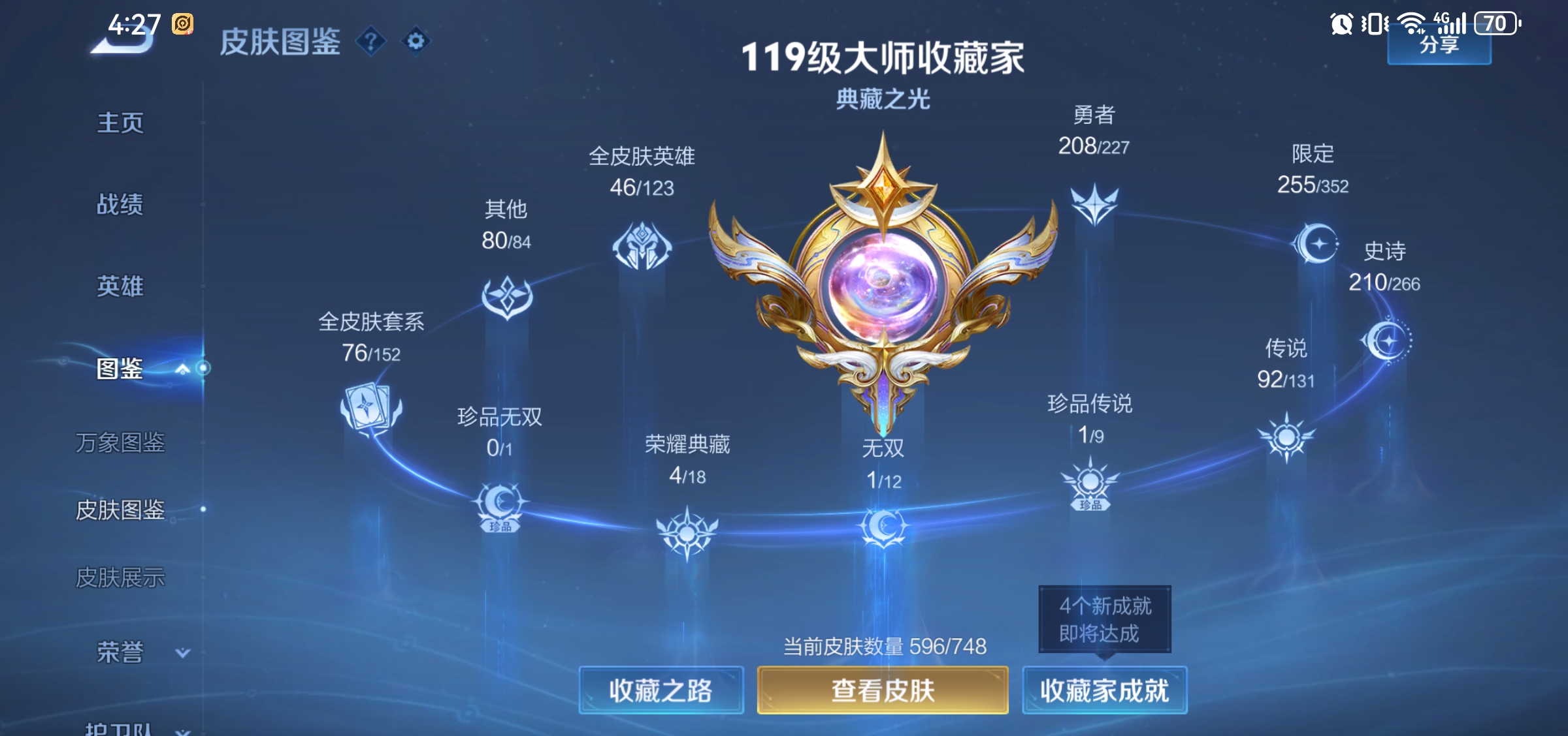 皮肤596 英雄127 绝世王者 荣耀典藏4 无双皮肤1 珍品传说1 传说92 其他皮肤245-唯一一个号玩到现在。有需要的过来