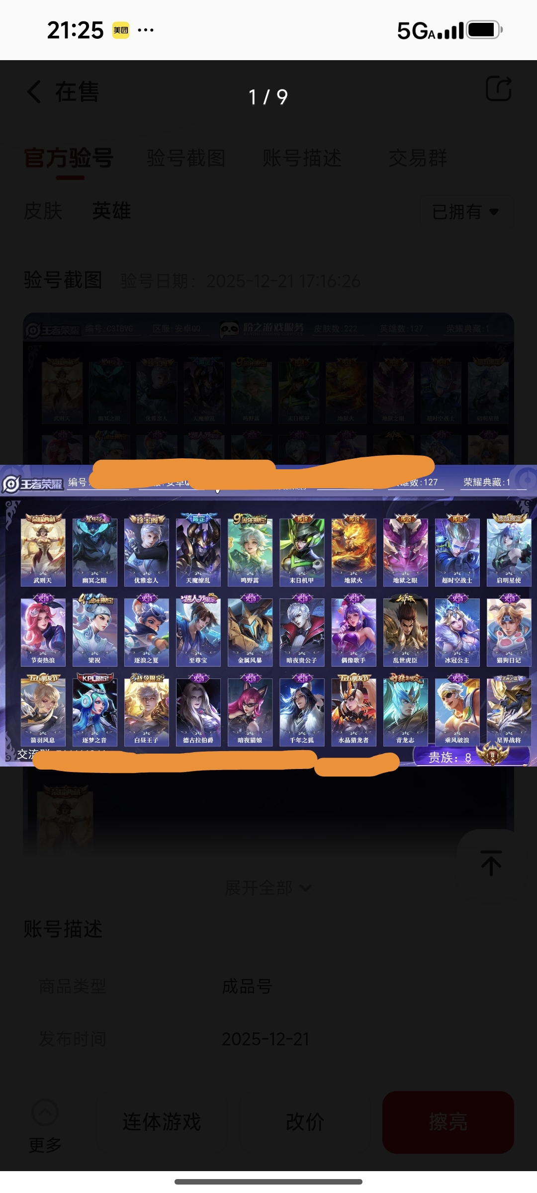 皮肤222 英雄127 荣耀王者 荣耀典藏1 传说7 其他皮肤82-svip8黄钻8王者v8十年的老账号还有武则天