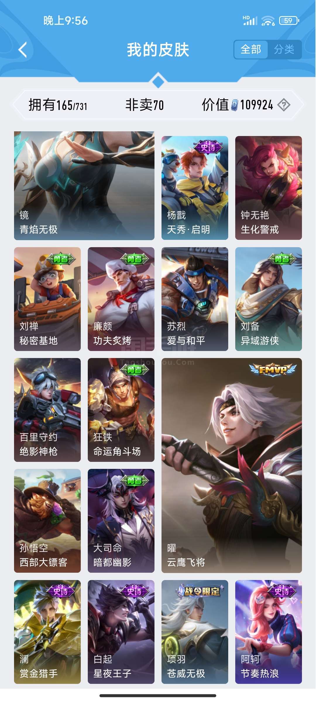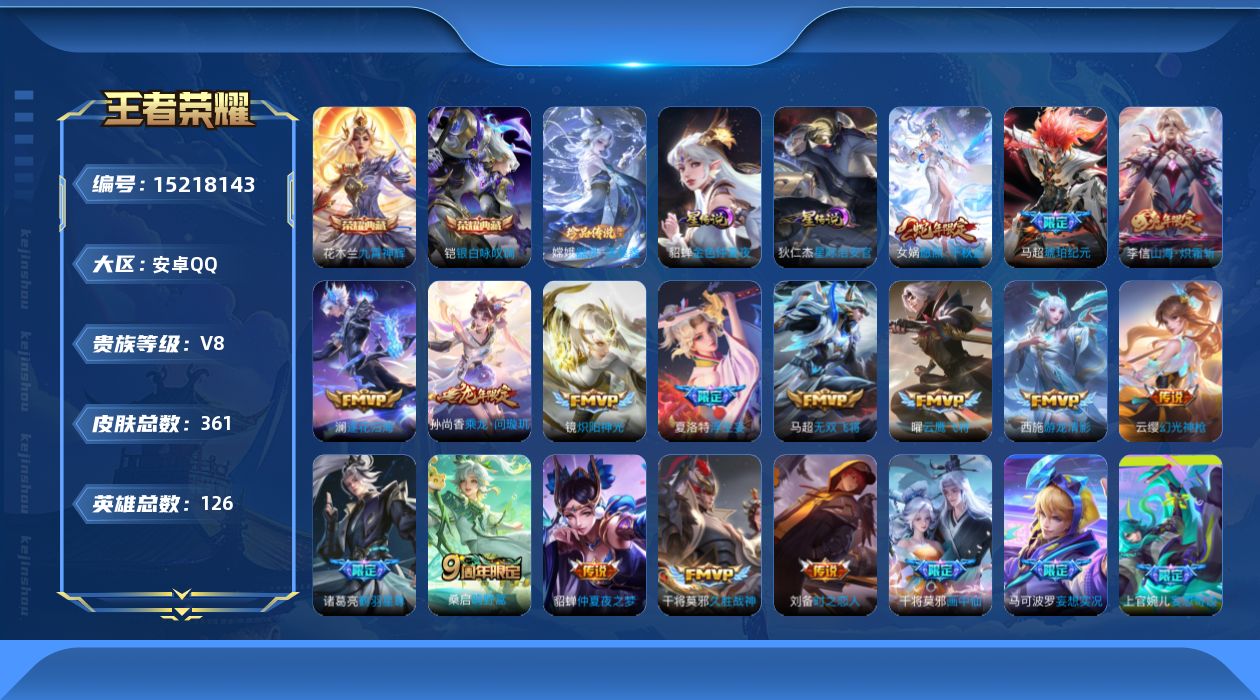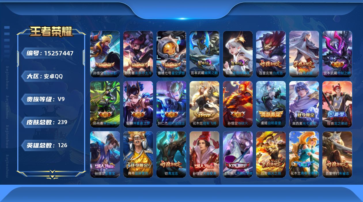 皮肤322 英雄126 荣耀王者 荣耀典藏3 传说18 其他皮肤125-皮肤很多 可小刀 看图