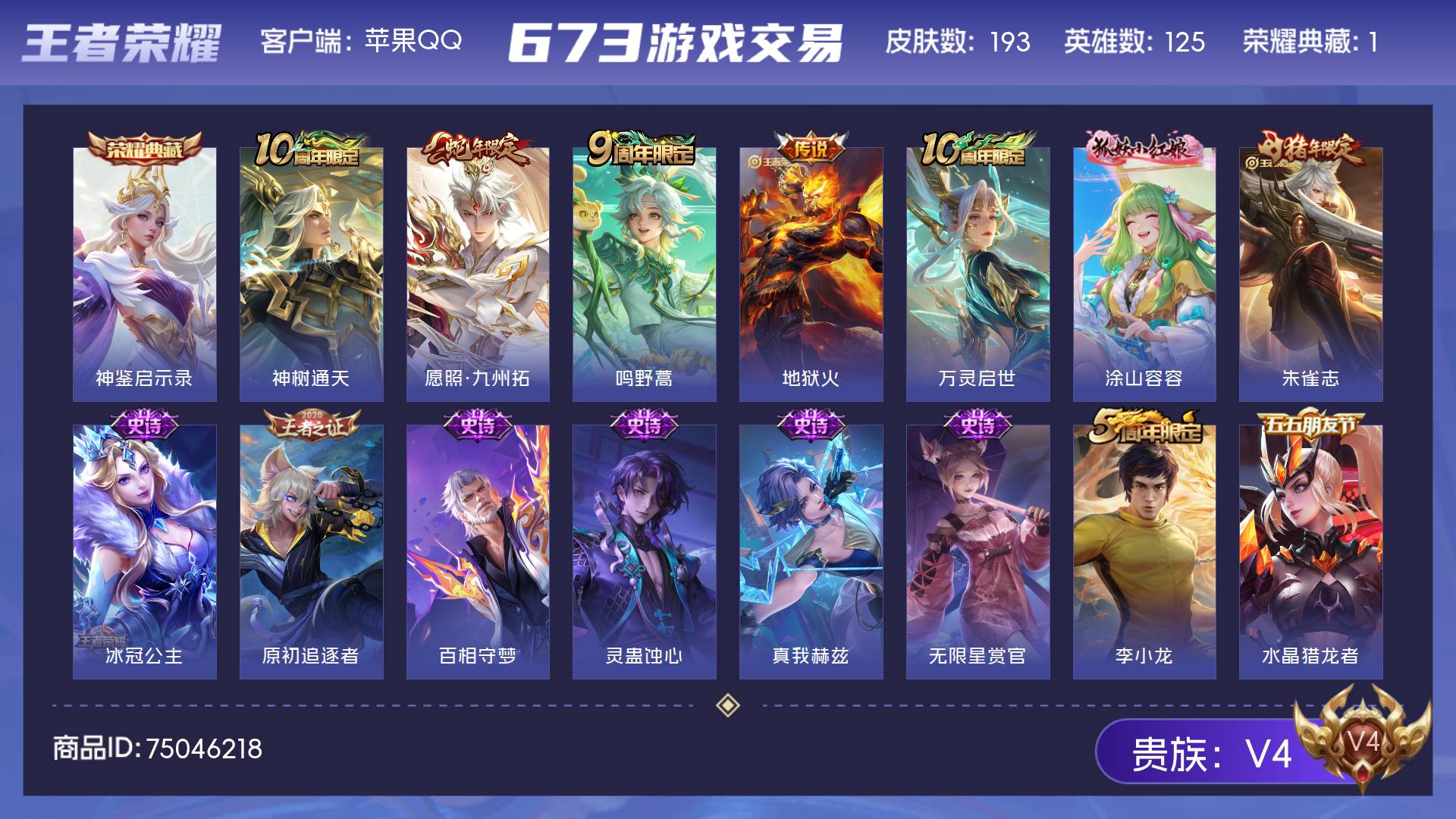 皮肤193 英雄125 荣耀王者 荣耀典藏1 传说4 其他皮肤69-【1典藏4传说1星元V4游戏禁言介意勿拍】苹果Q-193皮