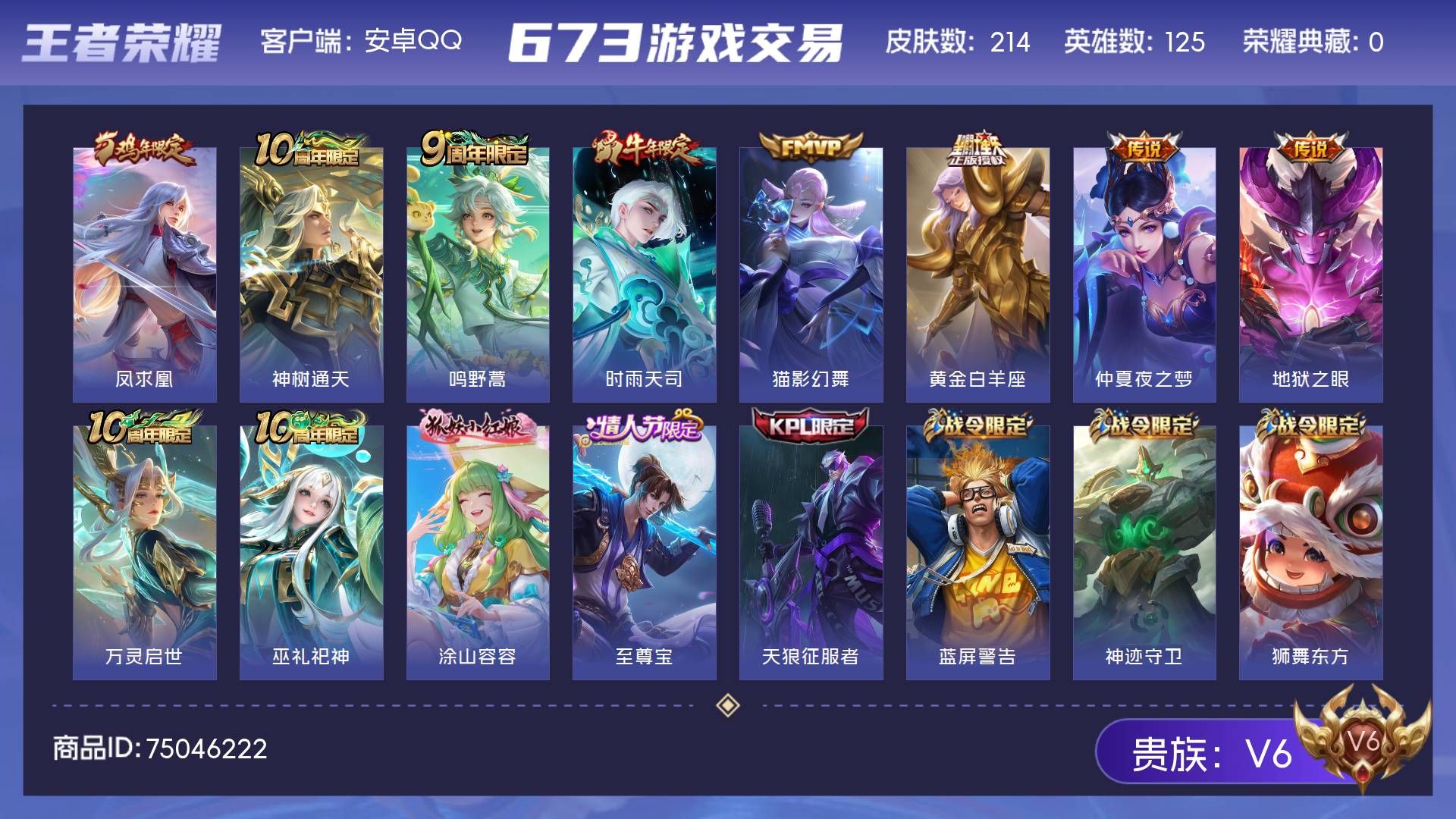 皮肤214 英雄125 绝世王者 传说8 其他皮肤89-【V6 6传说1星元金色仲夏夜 时雨天司 至尊宝 凤求凰】