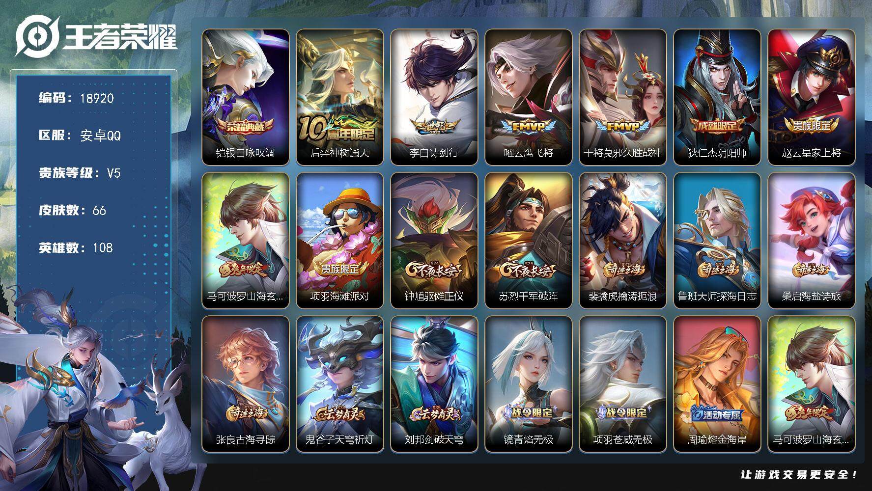 可换绑【V9精品号 李白全皮 老虎全皮 张良金标 打野47段 2典藏 2无双