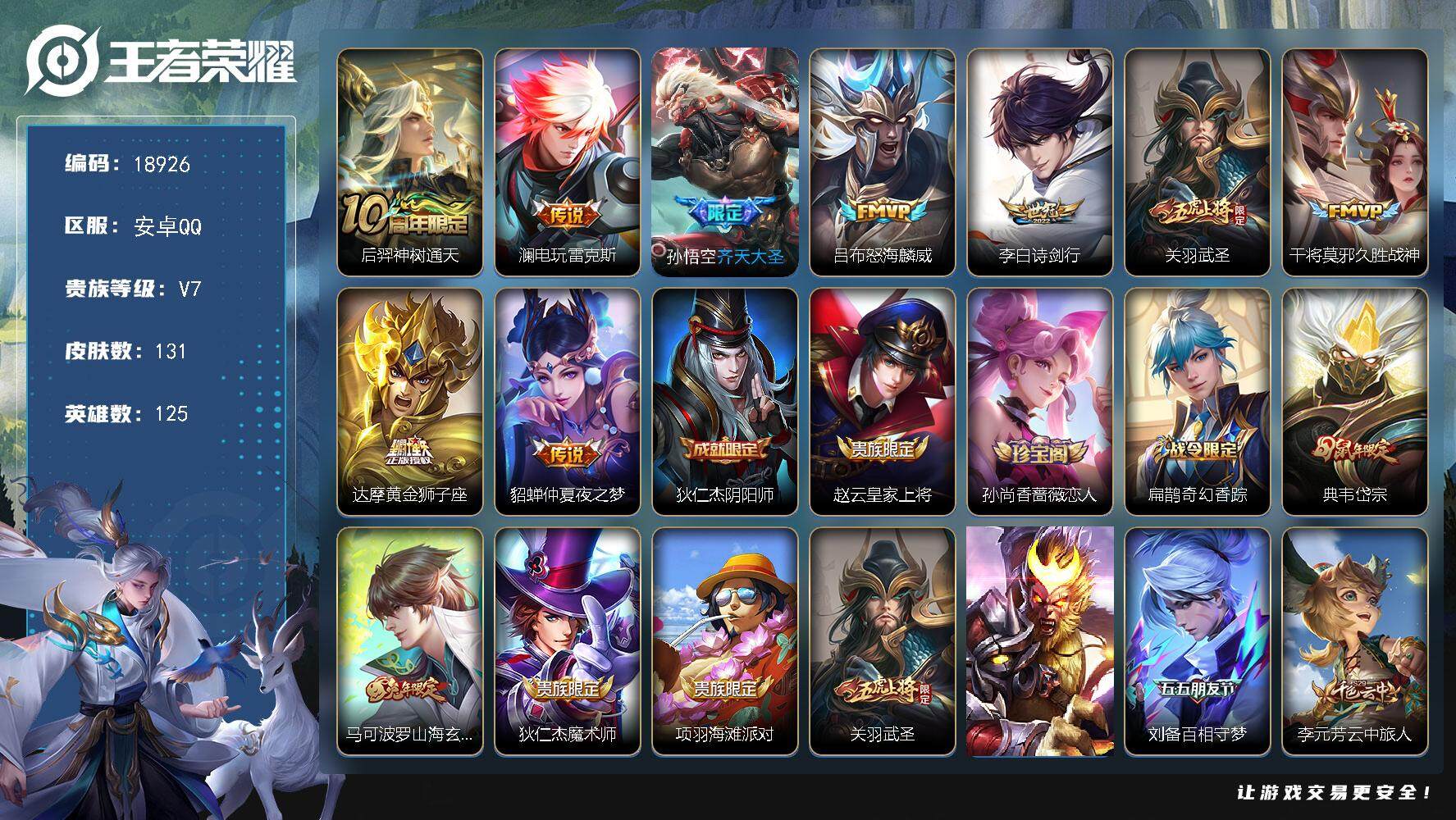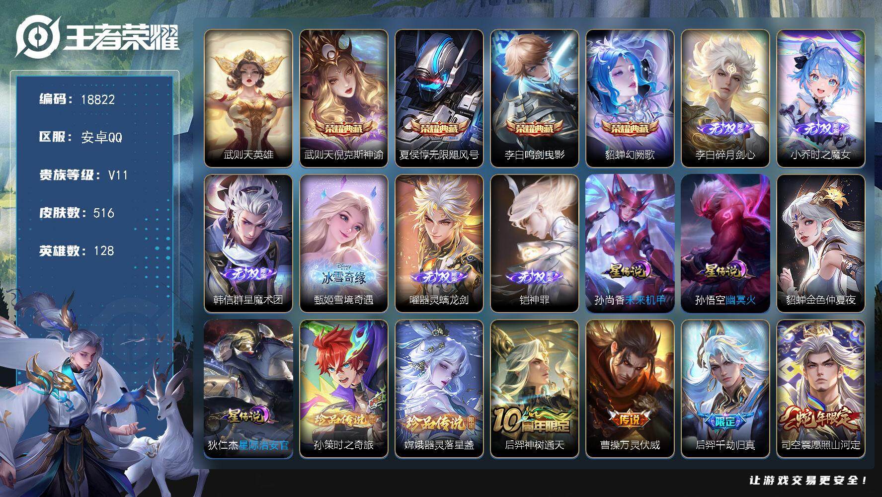 安卓QQ 皮肤167 英雄128 传说13 其他皮肤70 倔强青铜-小国标干将 万战马超 绝版皮肤天魔缭乱霸王别姬 神威 白虎志 时之思念 无双飞将 神威 千山共赴