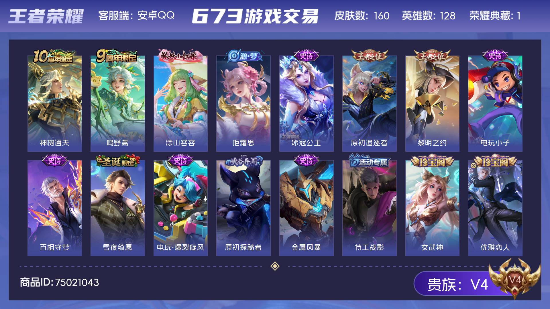 皮肤160 英雄128 传奇王者 荣耀典藏1 传说2 其他皮肤52-安卓Q-V4-最强王者段位-128英雄-160皮肤-1典藏英雄-2传说-31史
