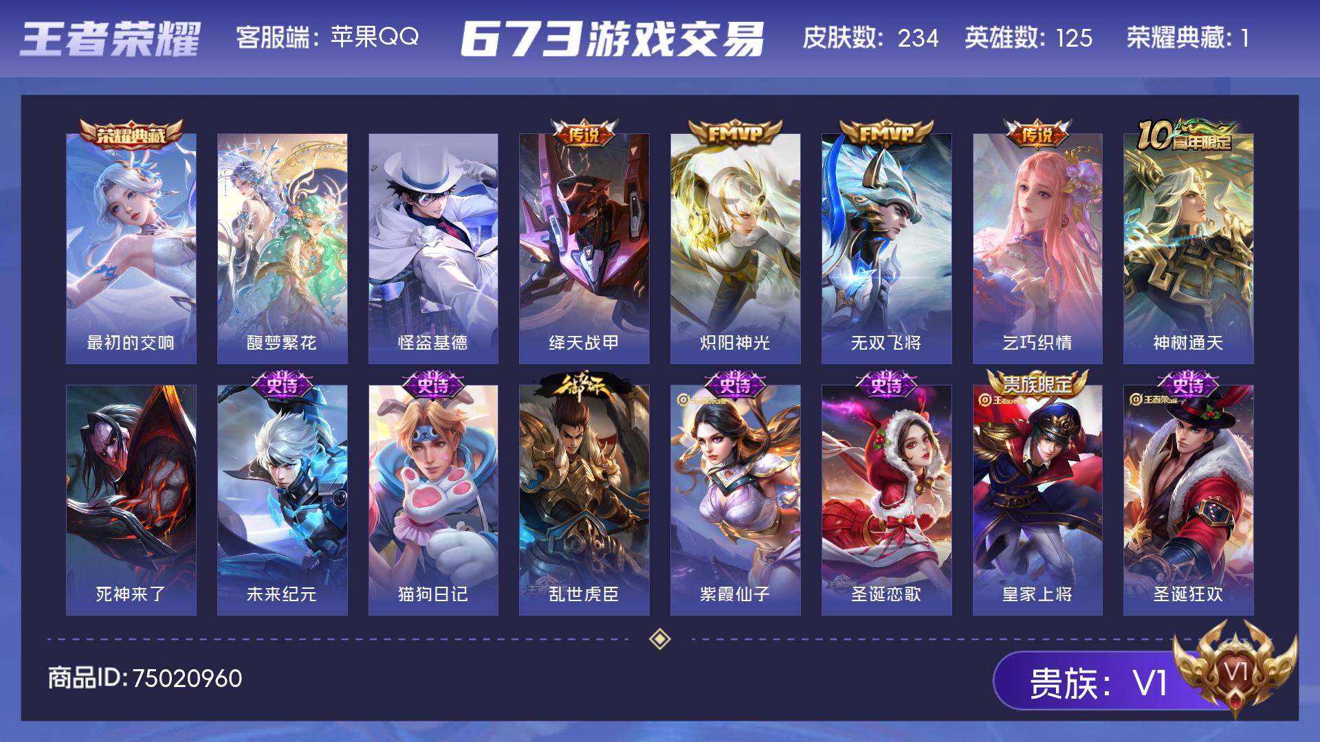 皮肤234 英雄125 无双王者 荣耀典藏1 珍品无双1 珍品传说1 传说5 其他皮肤101-苹果Q-V1-最强王者段位-125英雄-234皮肤-1典藏皮肤-1珍品无双-1
