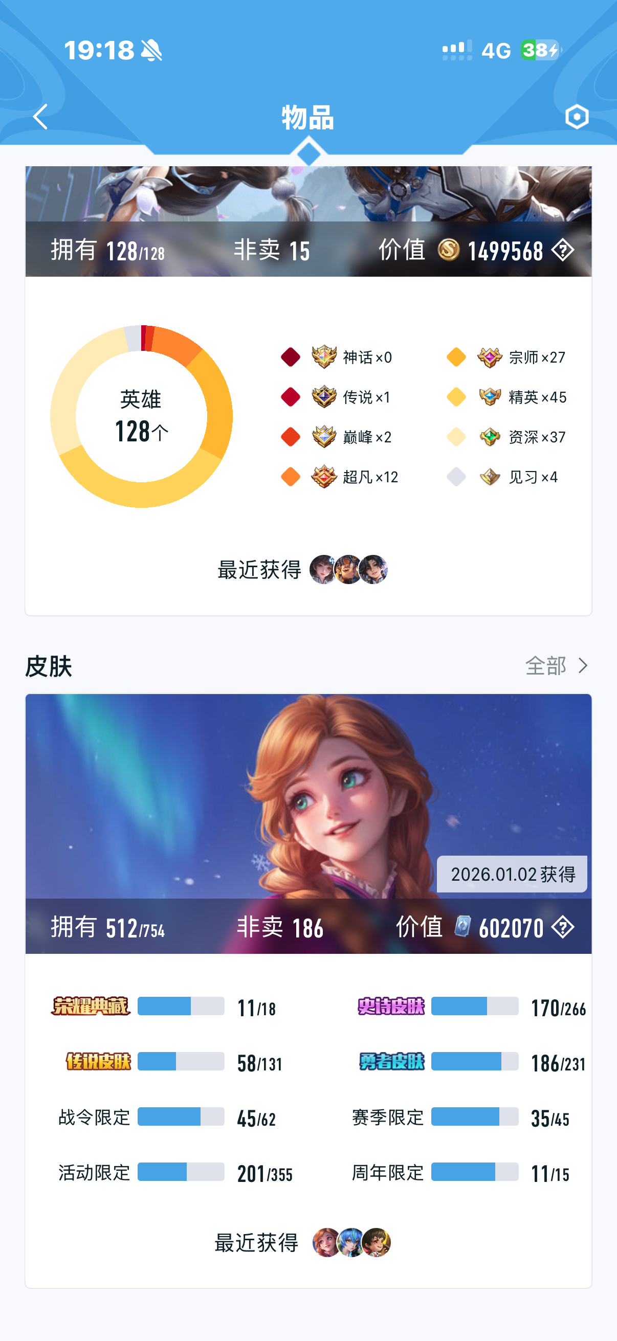 皮肤512 英雄128 非凡王者 荣耀典藏12 珍品传说3 传说58 其他皮肤215-V10 11典藏511皮肤11典藏58传说2珍品