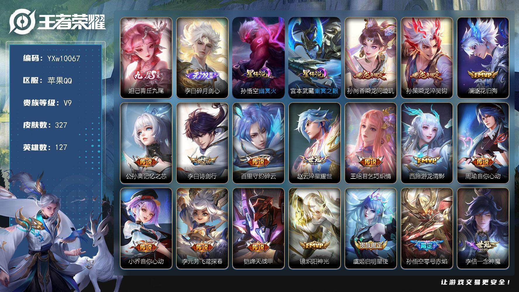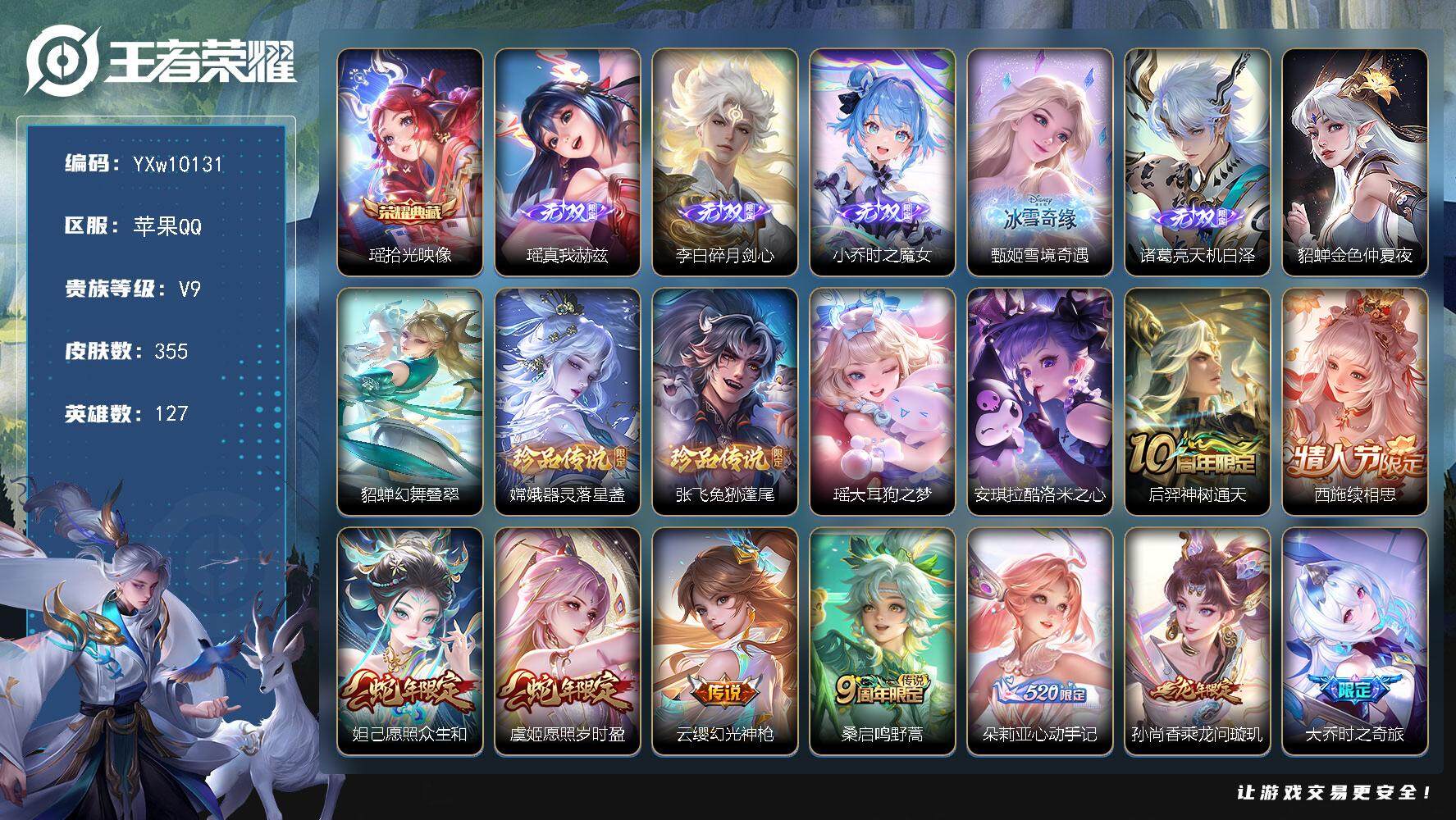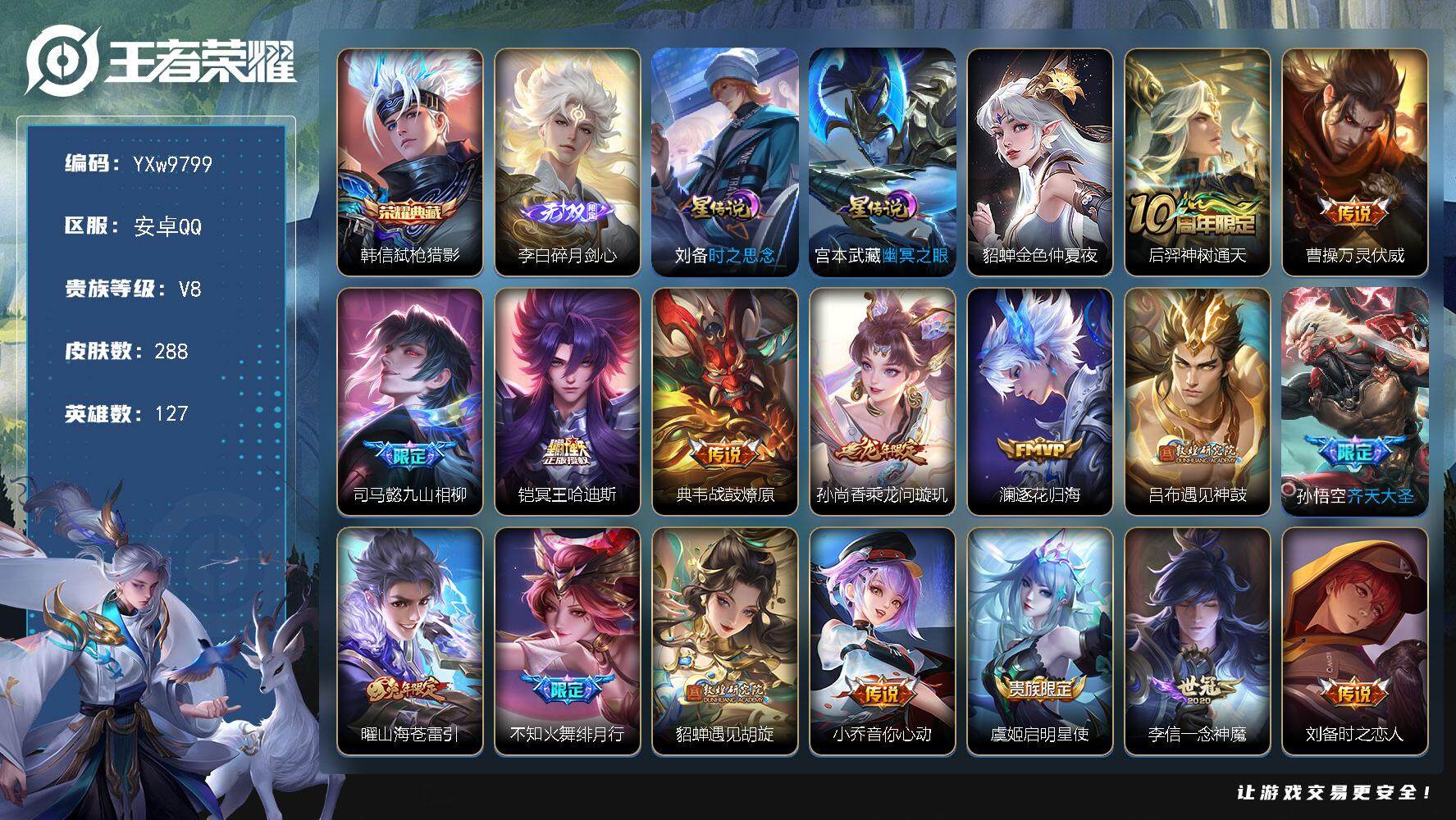 安卓QQ-1典藏-18传说-1无双-294皮肤-127英雄-无双王者-可二次实名。3珍宝,1无双,18传说,1典藏