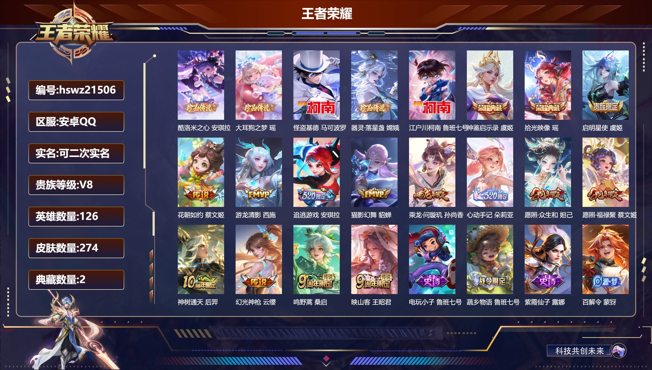 安卓QQ/永恒钻石/274皮肤/126英雄/2典藏/0珍品无双/0无双/5珍品传说/13传说/83史
