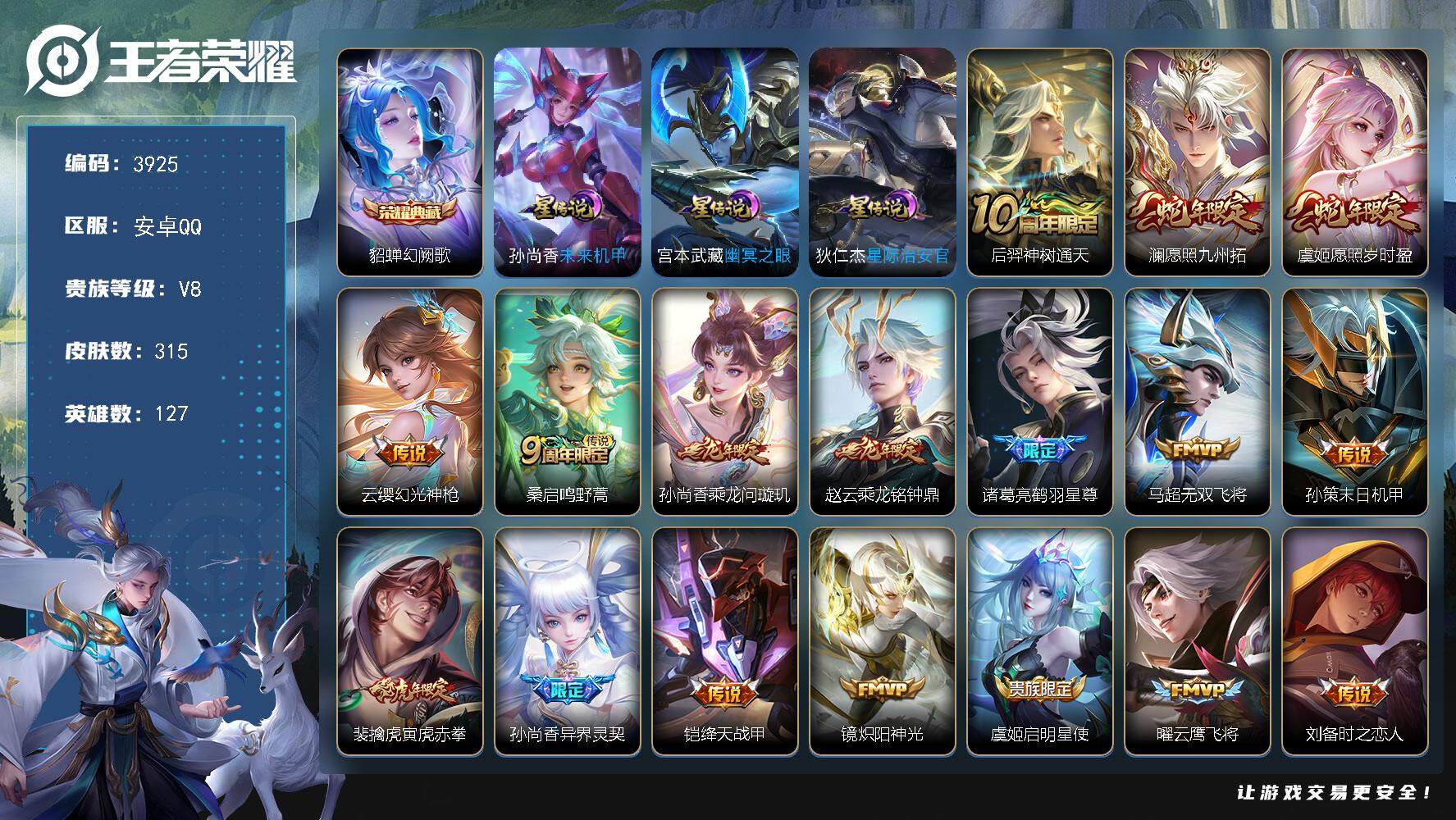 安卓Q-V8-最强王者段位-127英雄-315皮肤-1典藏皮肤-25传说-93