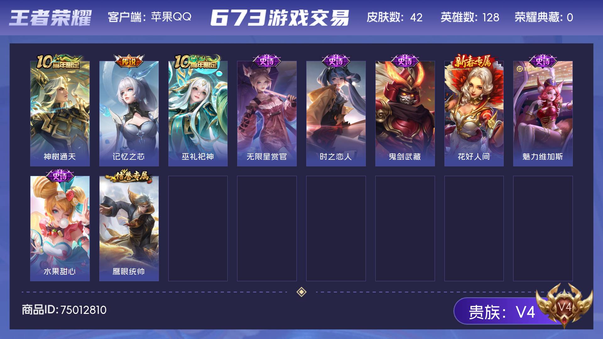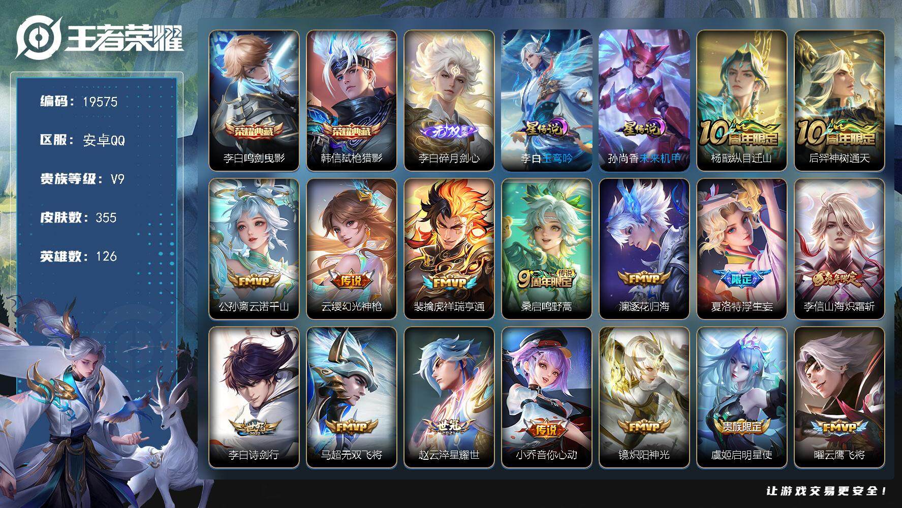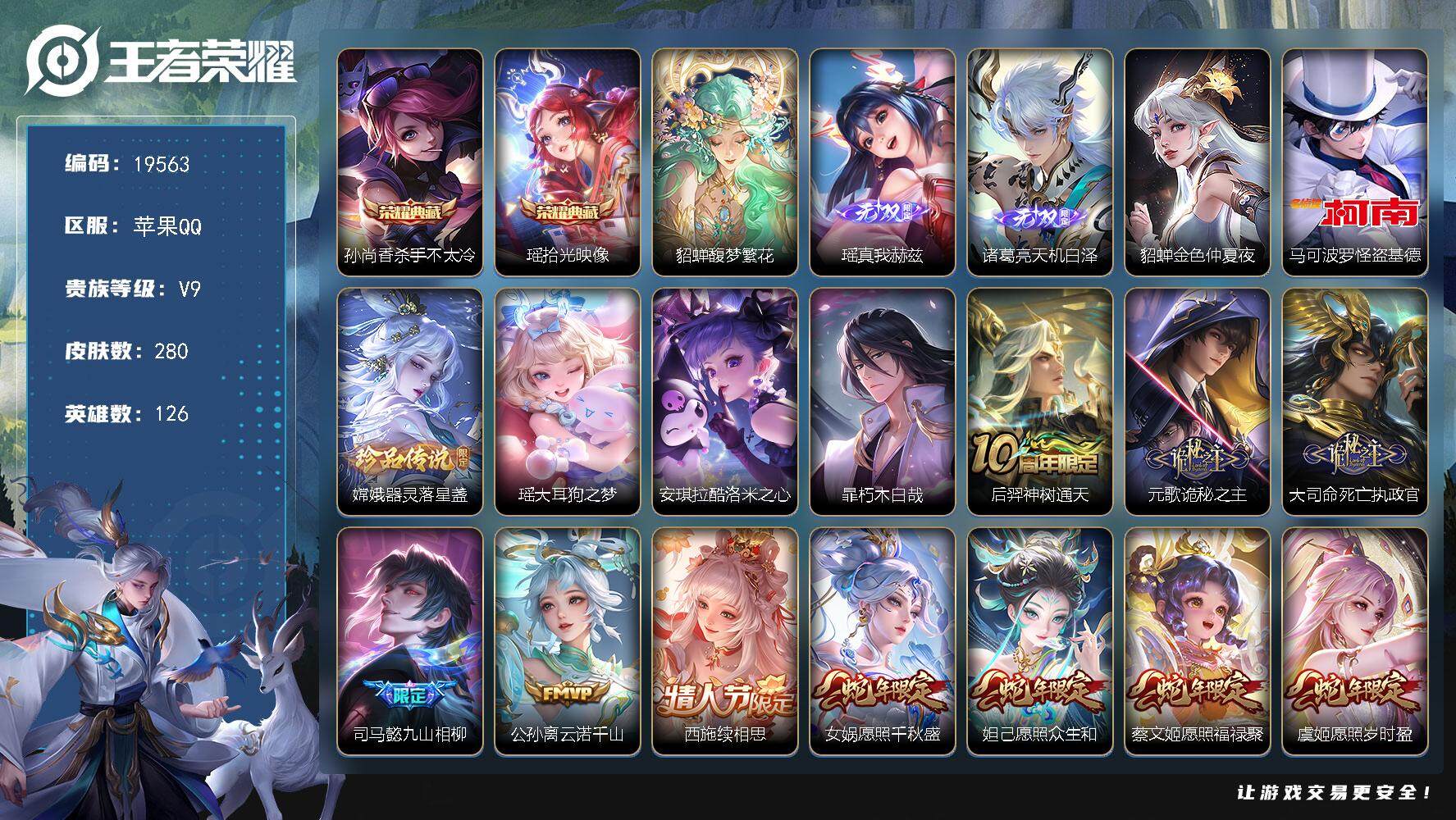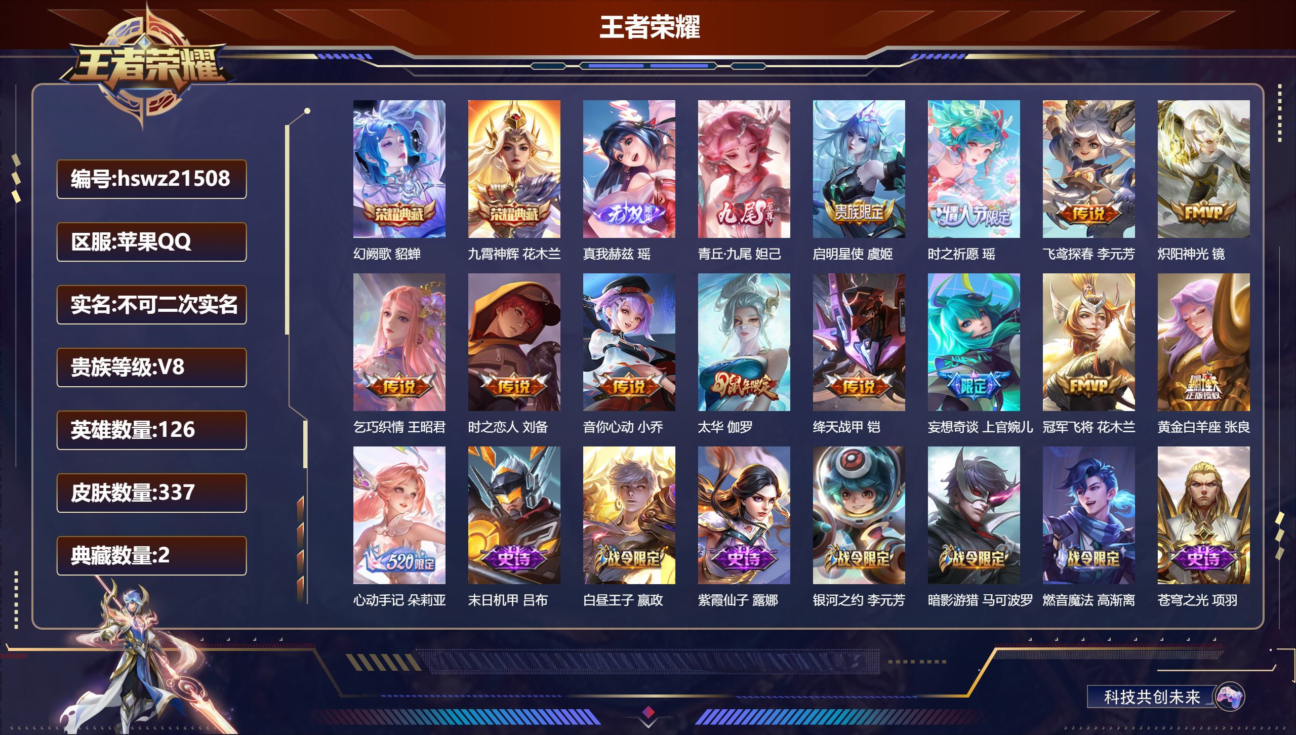 苹果QQ/荣耀王者/337皮肤/126英雄/2典藏/0珍品无双/2无双/0珍品传说/13传说/96史