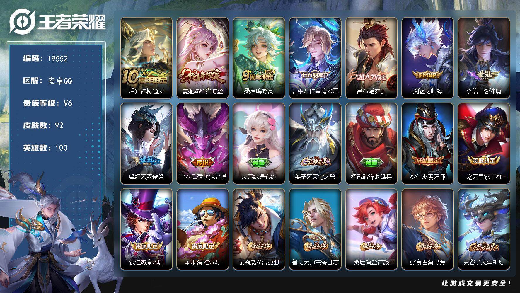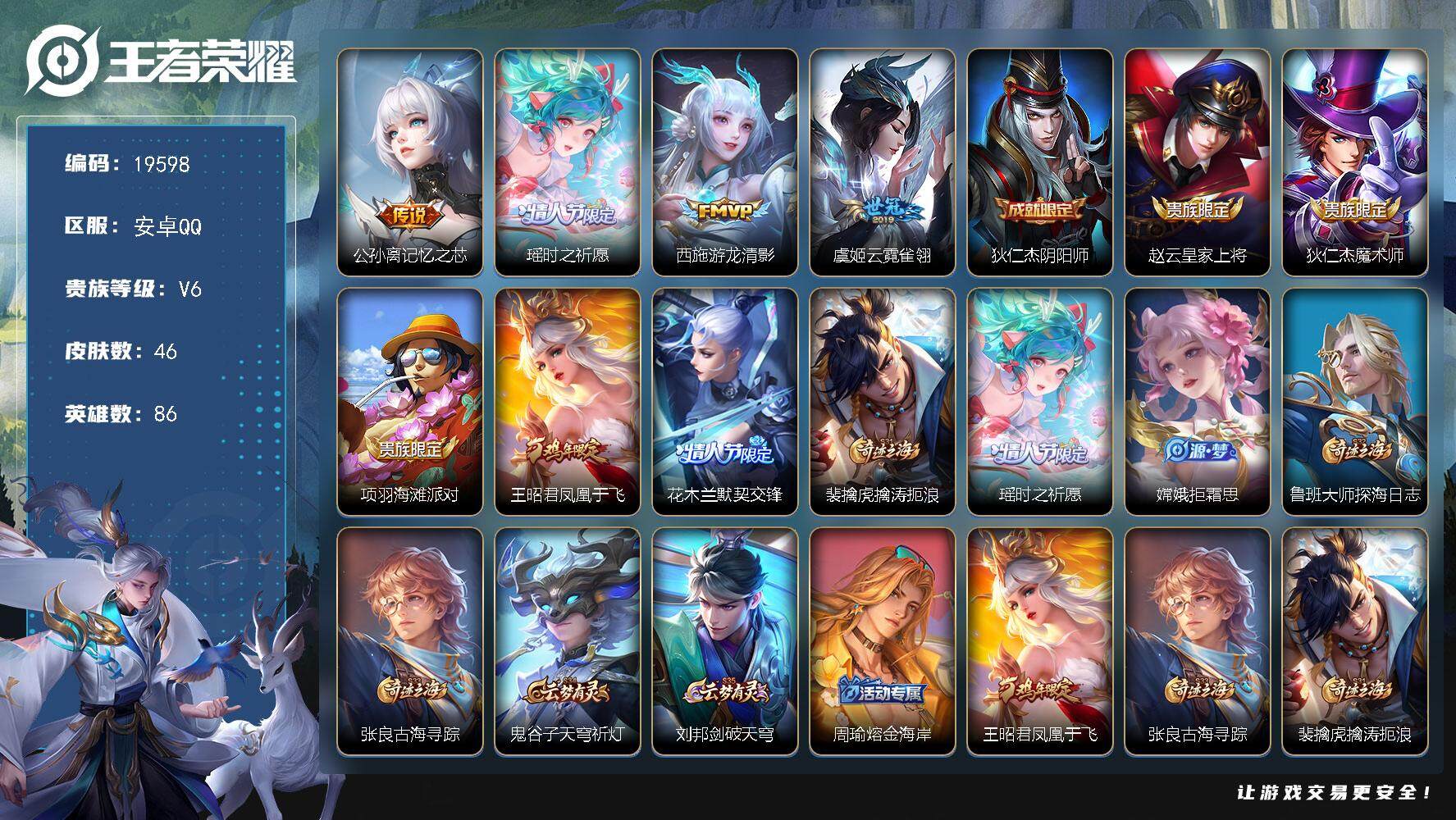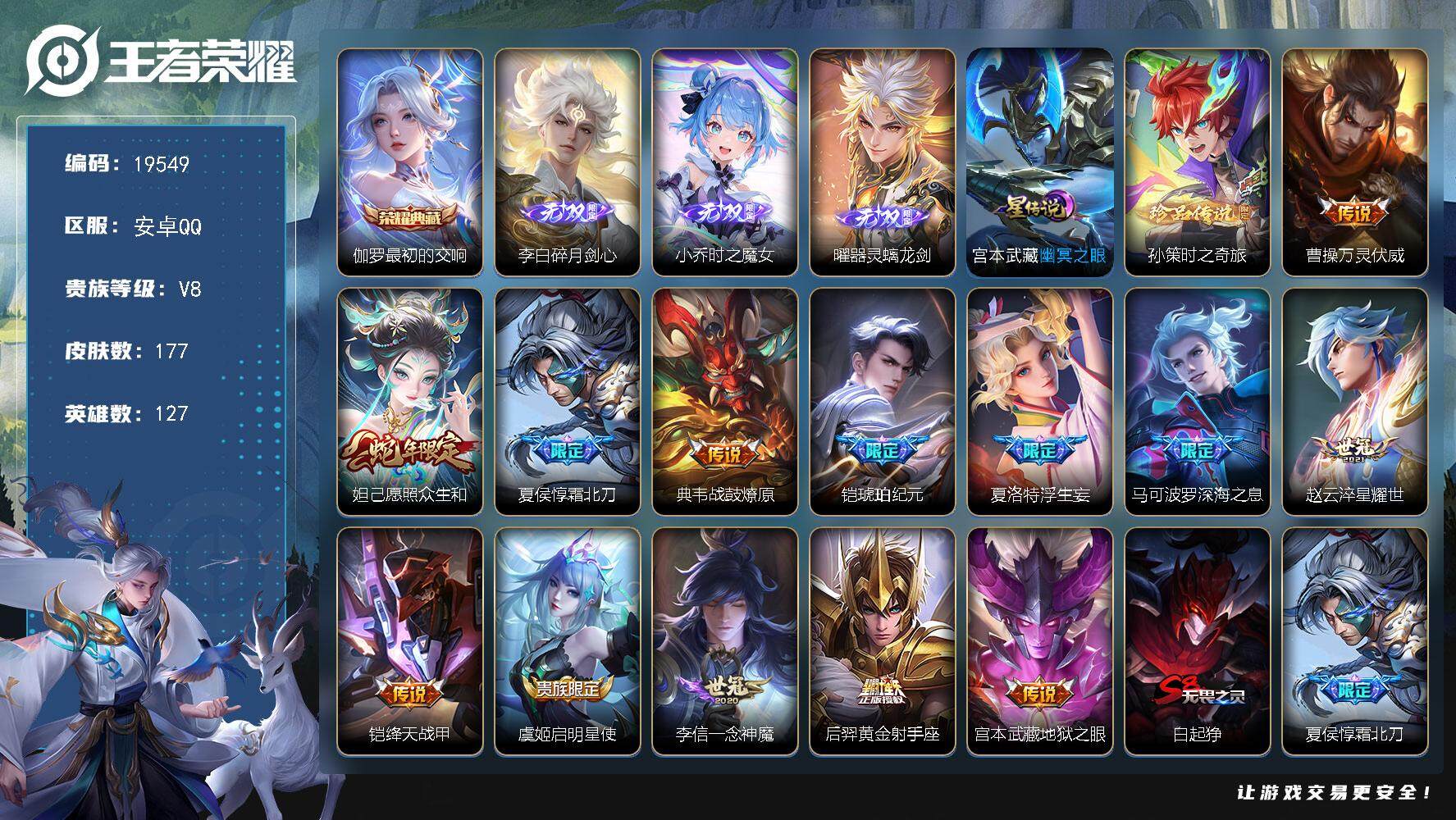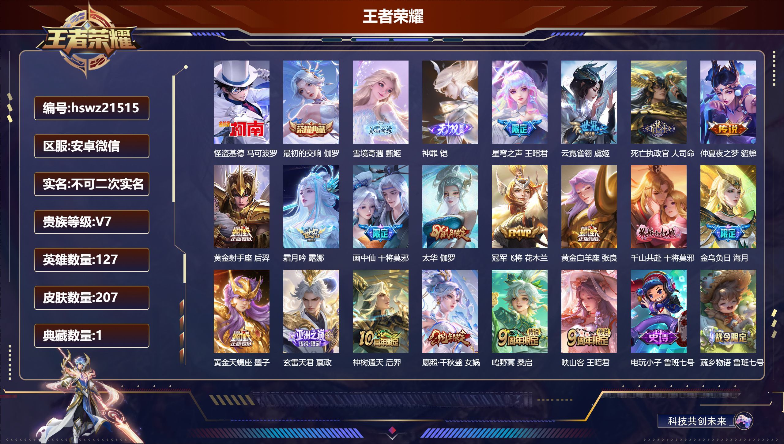 安卓v/荣耀王者/207皮肤/127英雄/1典藏/0珍品无双/2无双/1珍品传说/18传说/75史