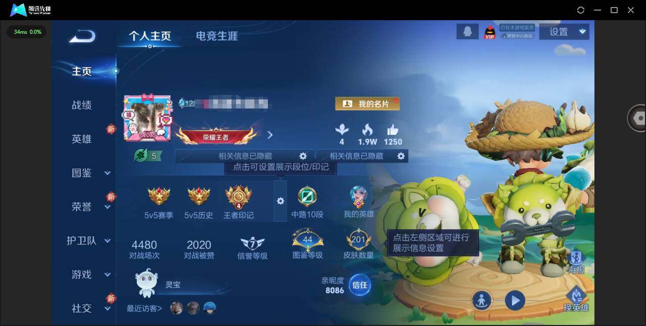 贵族等级: V6 英雄数: 125 皮肤数: 201 荣耀水晶: 拾光映像 传