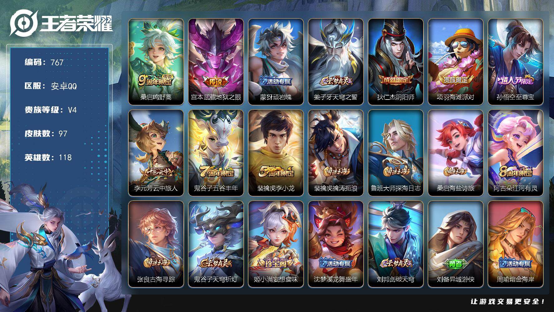 1915075 王者荣耀账号 安卓Q-V4-最强王者段位-118英雄-97皮肤