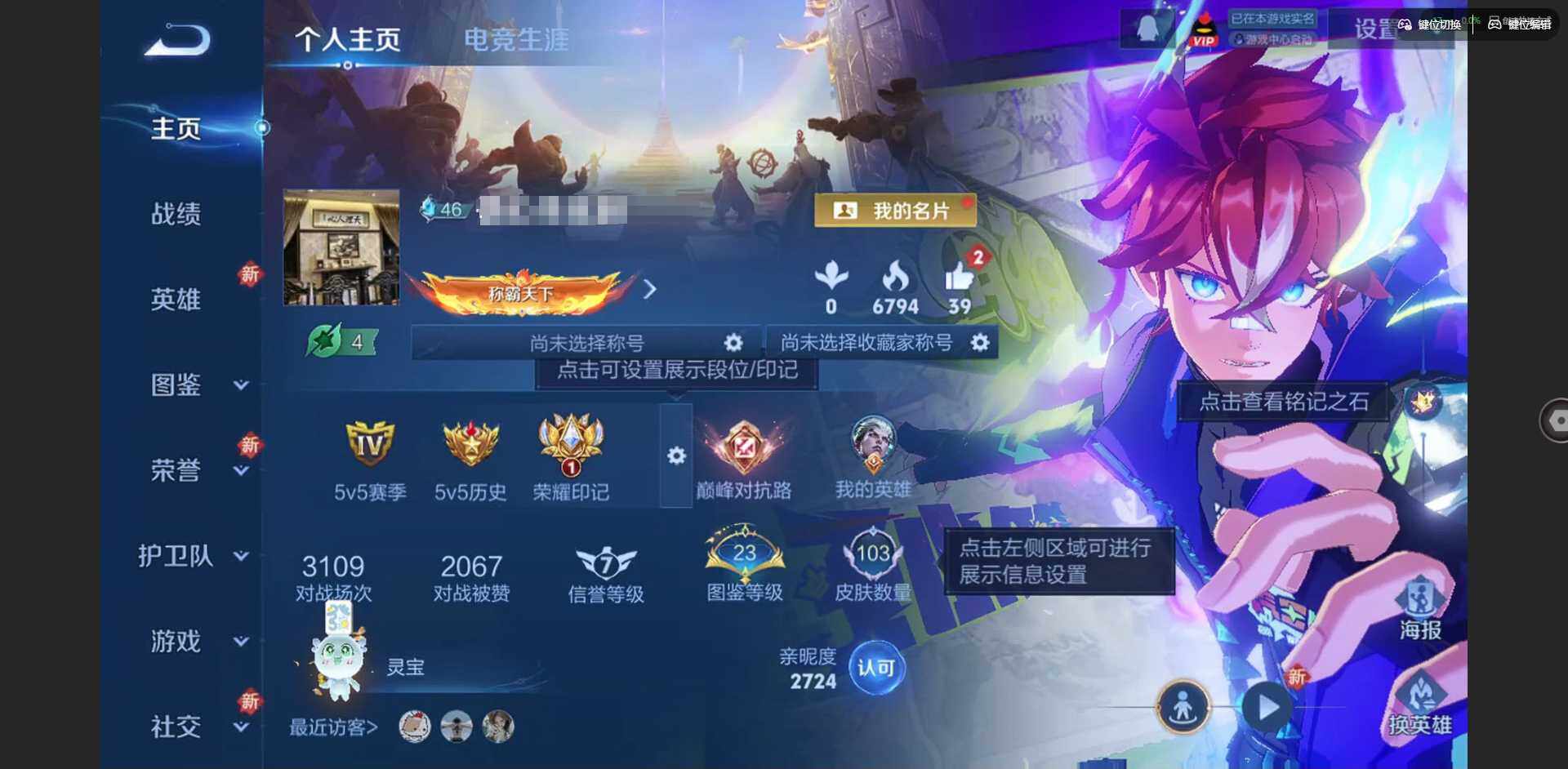 实名: 可修改 贵族等级: V6 英雄数: 104 皮肤数: 103 珍品传说
