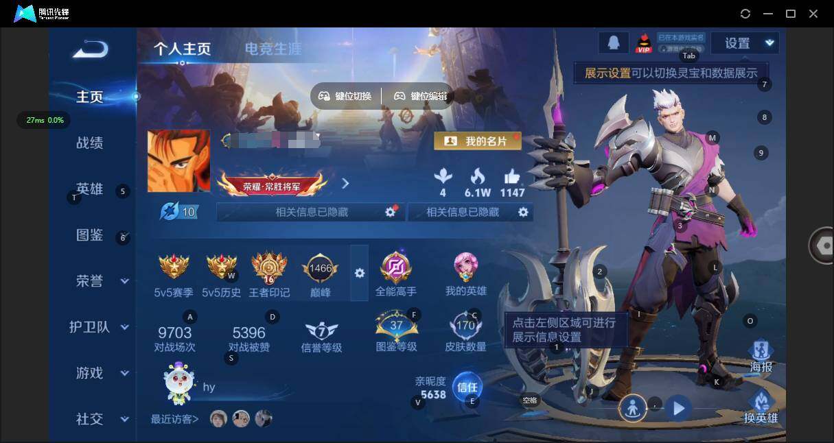 实名: 可修改 贵族等级: V5 英雄数: 125 皮肤数: 170 星传说:
