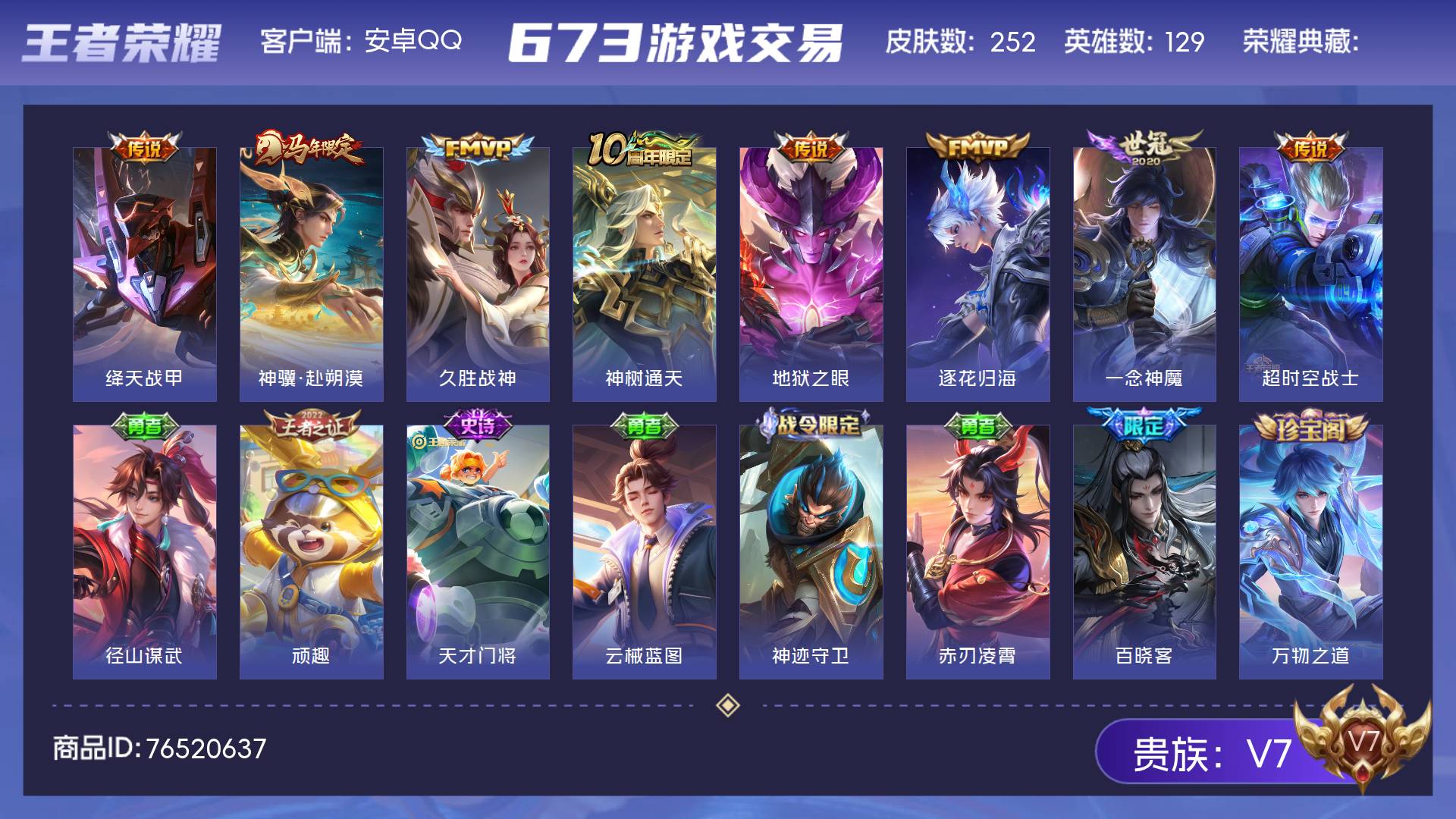 V7 皮肤252 英雄129 至尊星耀 星传说1 传说8