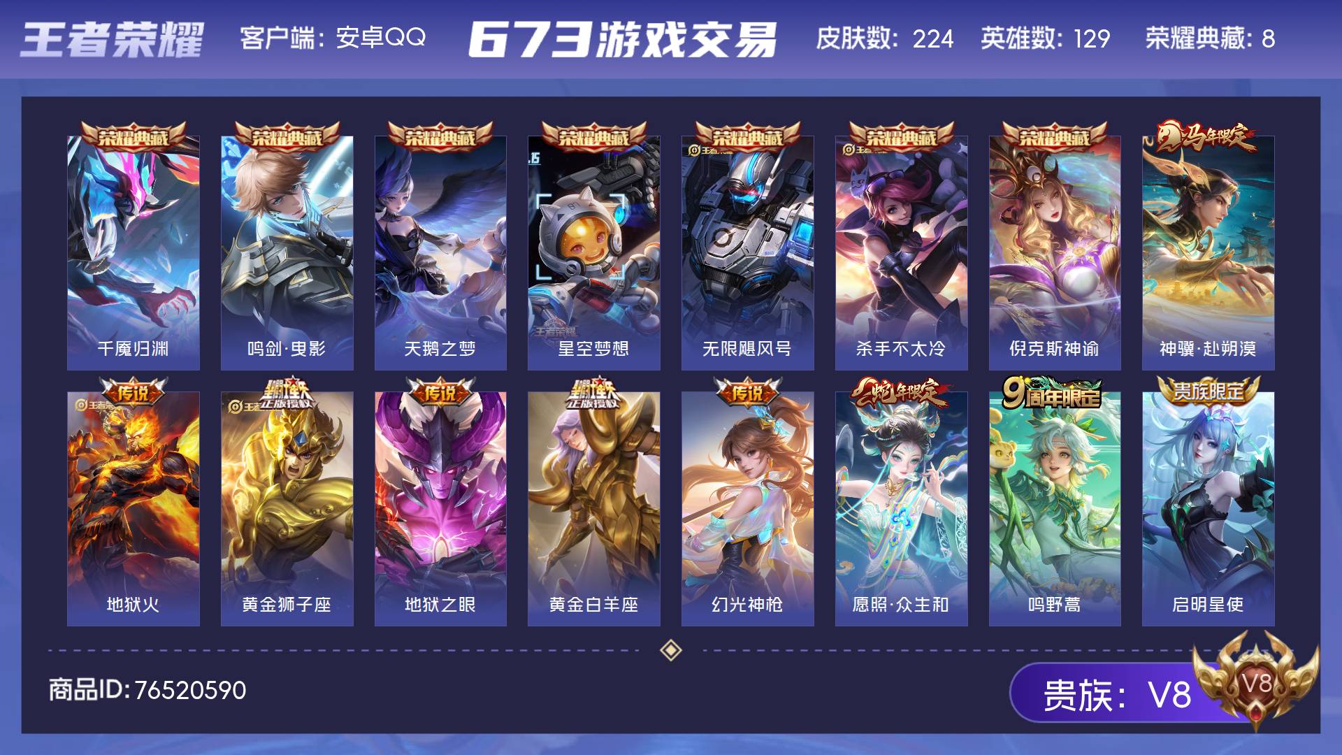 V8 皮肤224 英雄129 永恒钻石 荣耀典藏8 星传说3 传说14