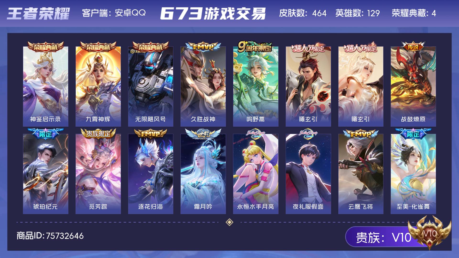 V10 皮肤464 英雄129 至尊星耀 荣耀典藏4 传说68 其他皮肤395