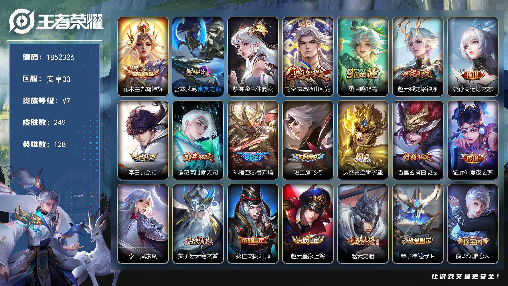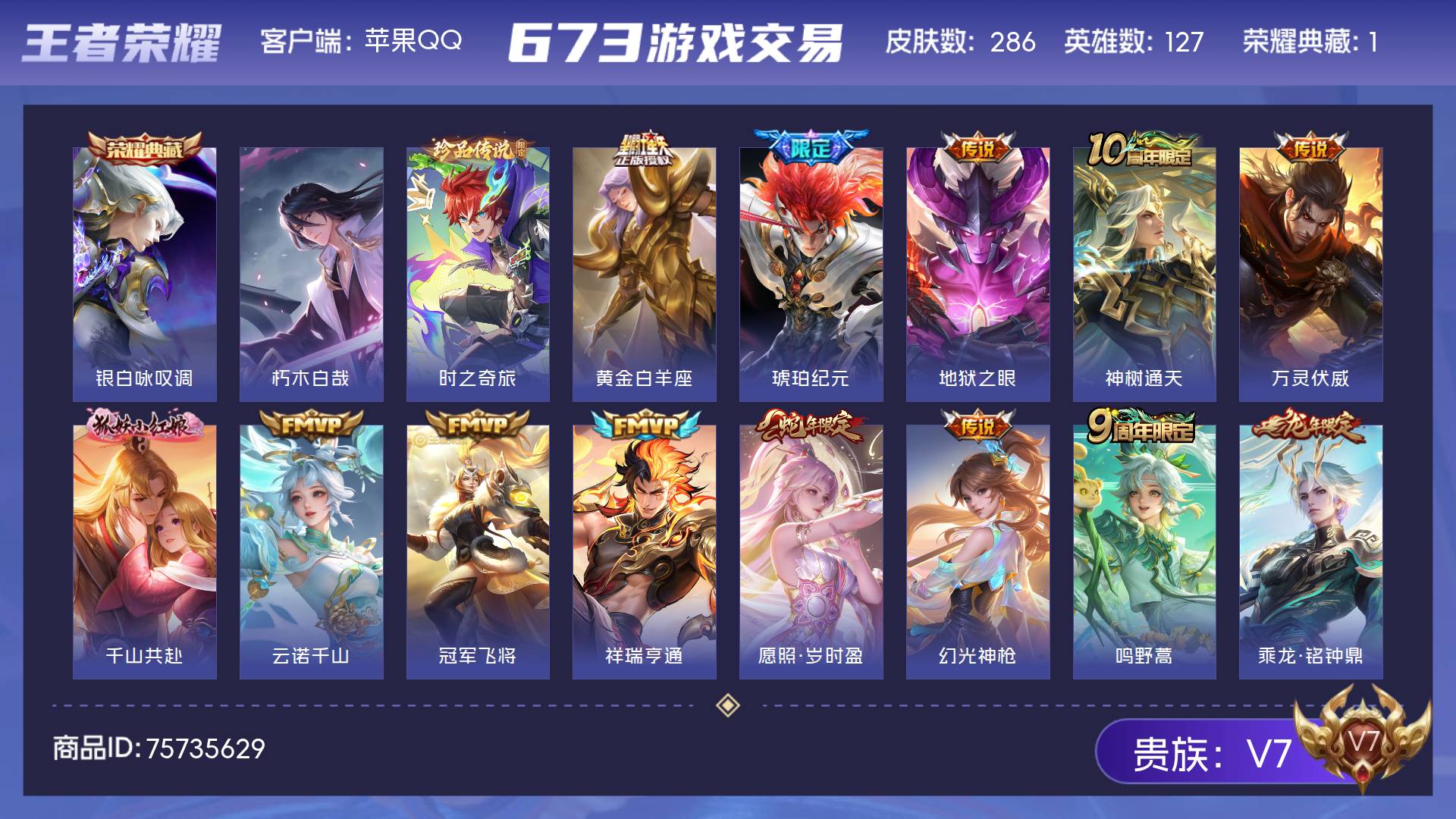 V7 皮肤286 英雄127 绝世王者 荣耀典藏1 珍品传说2 星传说1 传说16 其他皮肤270