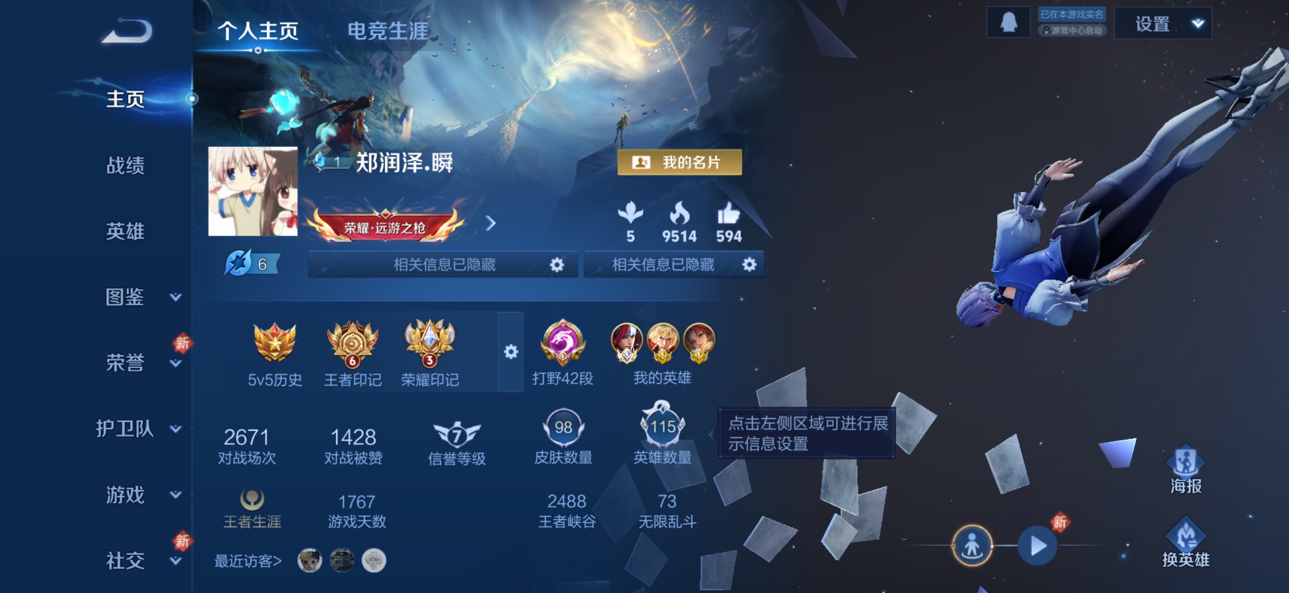 12次印记上过一次荣耀王者现在星耀4主玩李白有荣耀典藏还有些各种勇者史诗没有传说