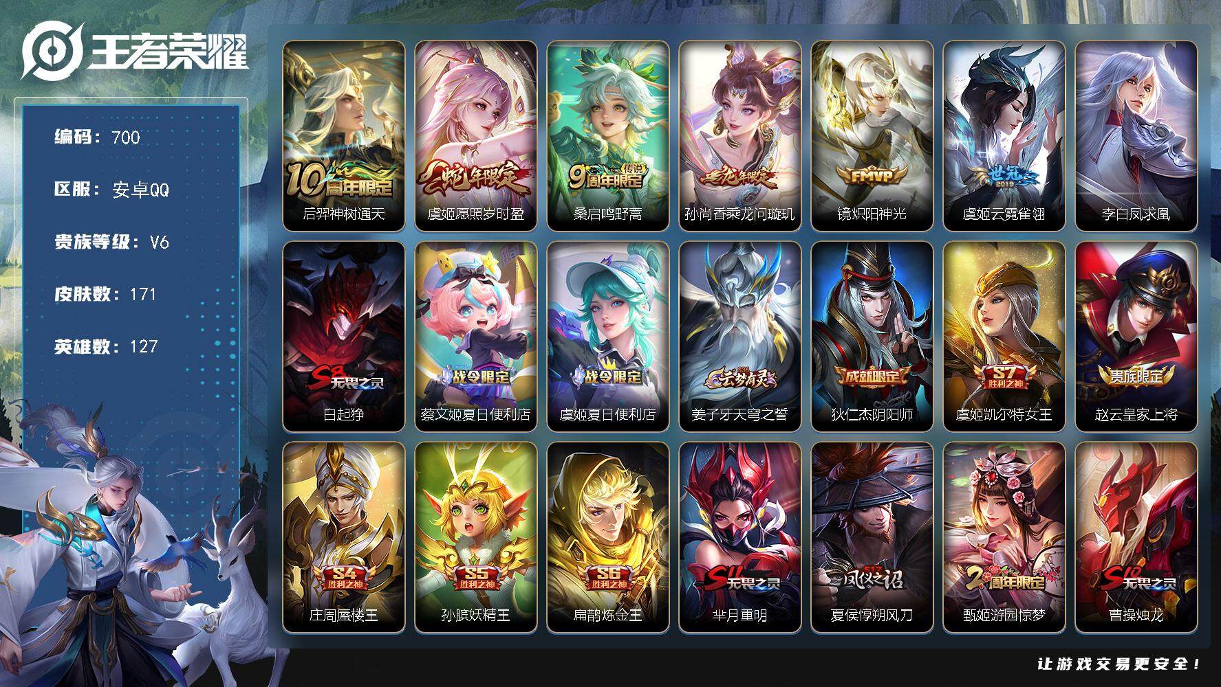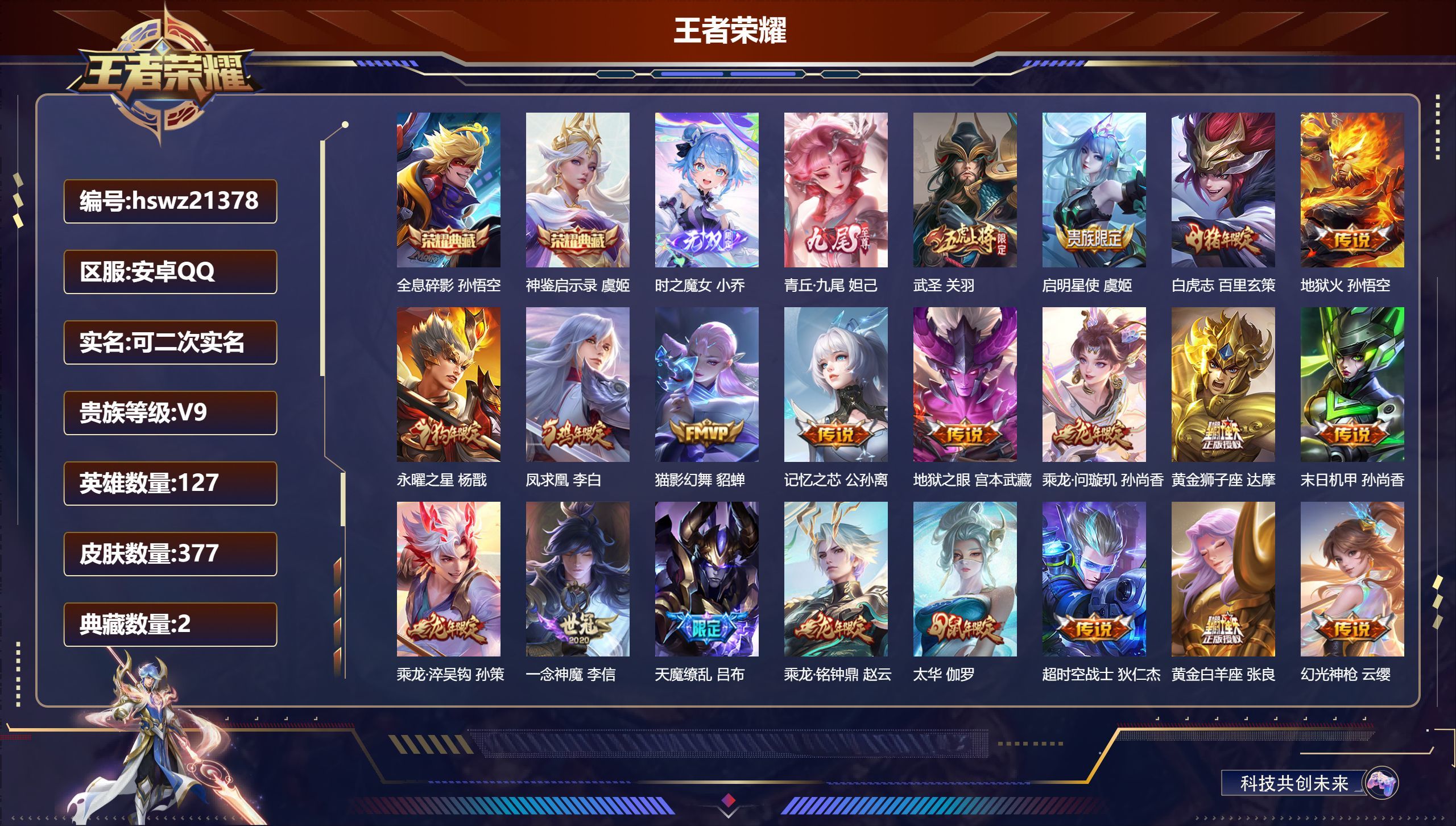 安卓QQ/至圣王者/377皮肤/127英雄/2典藏/0珍品无双/2无双/0珍品传说/22传说/115