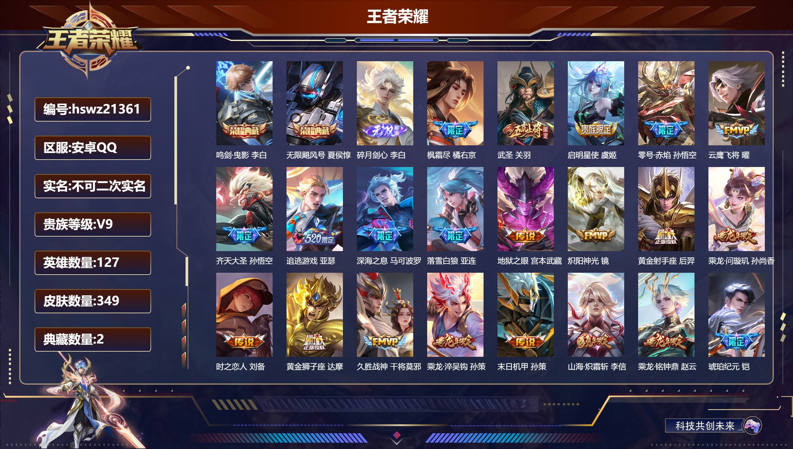 安卓QQ/永恒钻石/349皮肤/127英雄/2典藏/0珍品无双/1无双/0珍品传说/30传说/98史