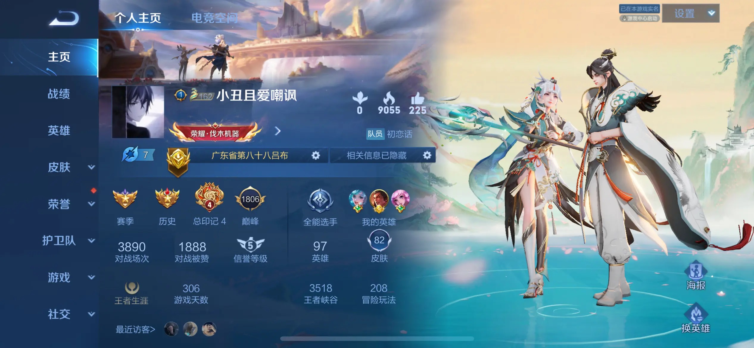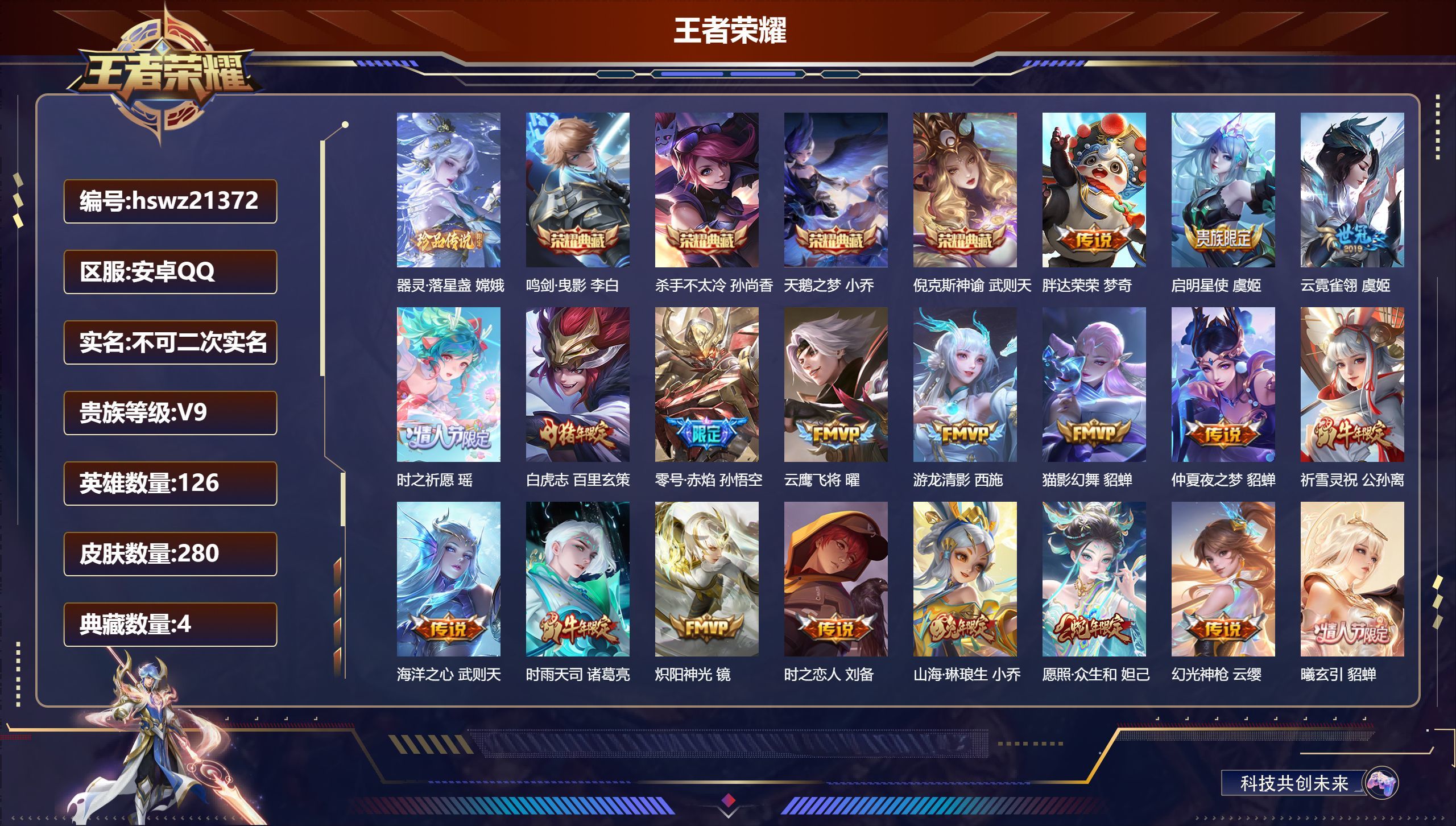 安卓QQ/荣耀王者/280皮肤/126英雄/4典藏/0珍品无双/0无双/1珍品传说/21传说/92史