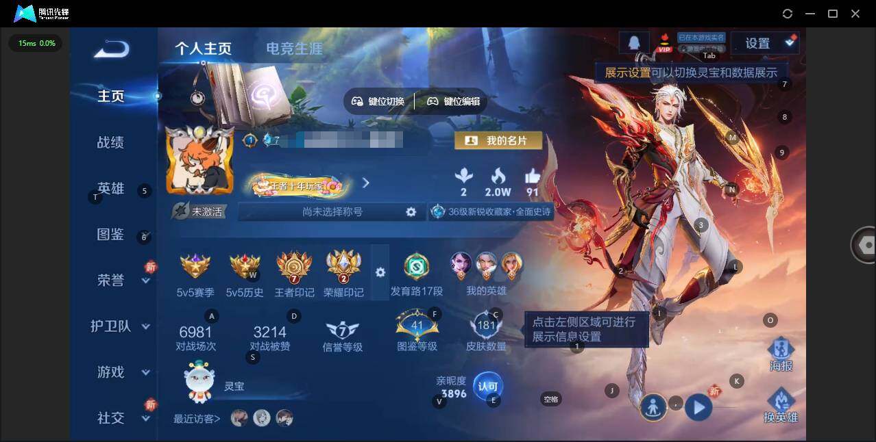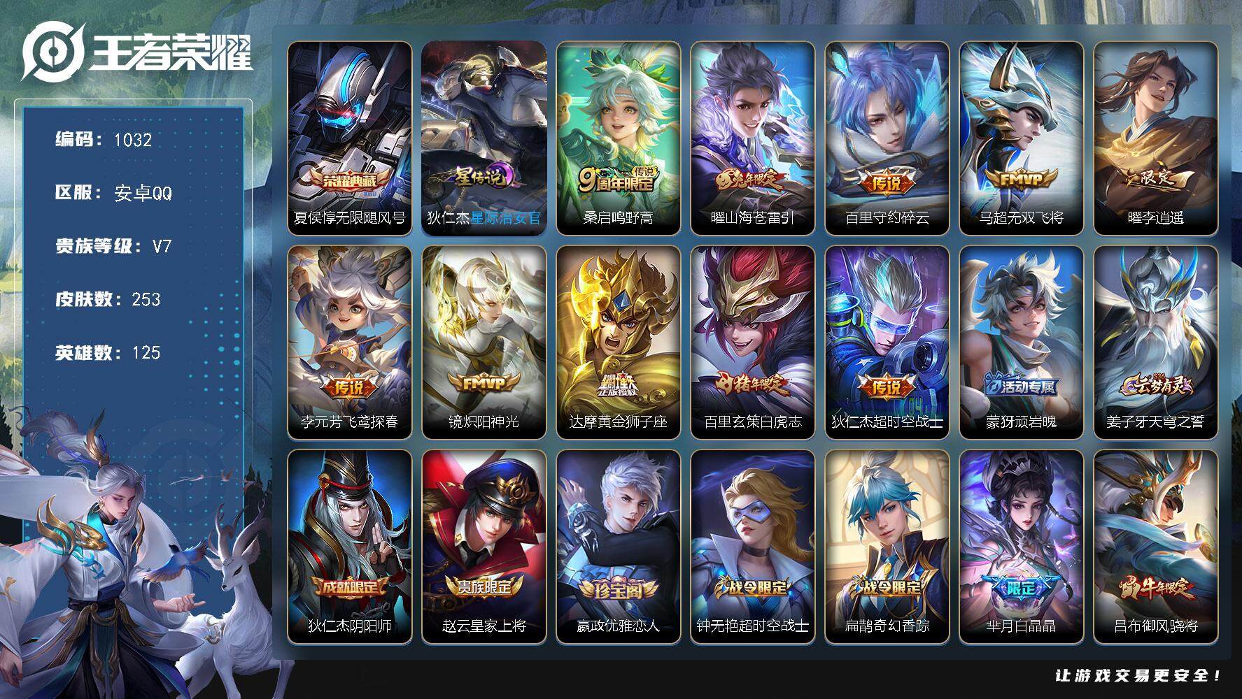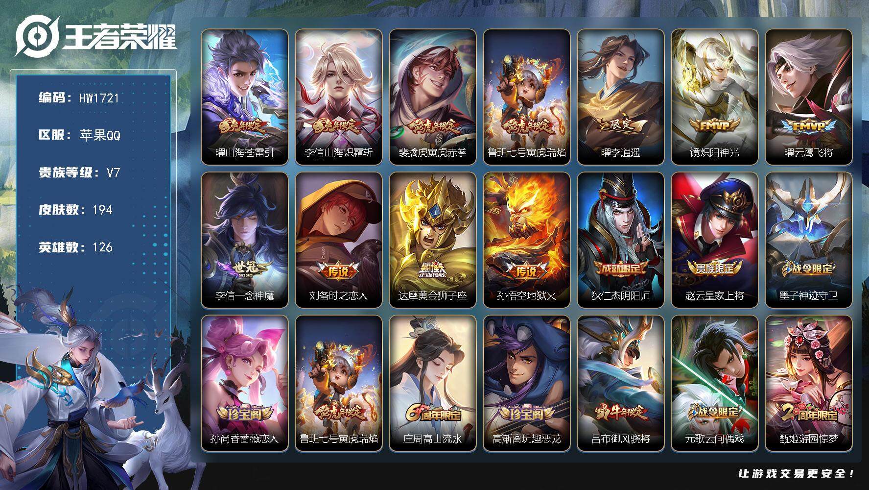 实名: 可修改 贵族等级: V7 英雄数: 126 皮肤数: 181 星传说: