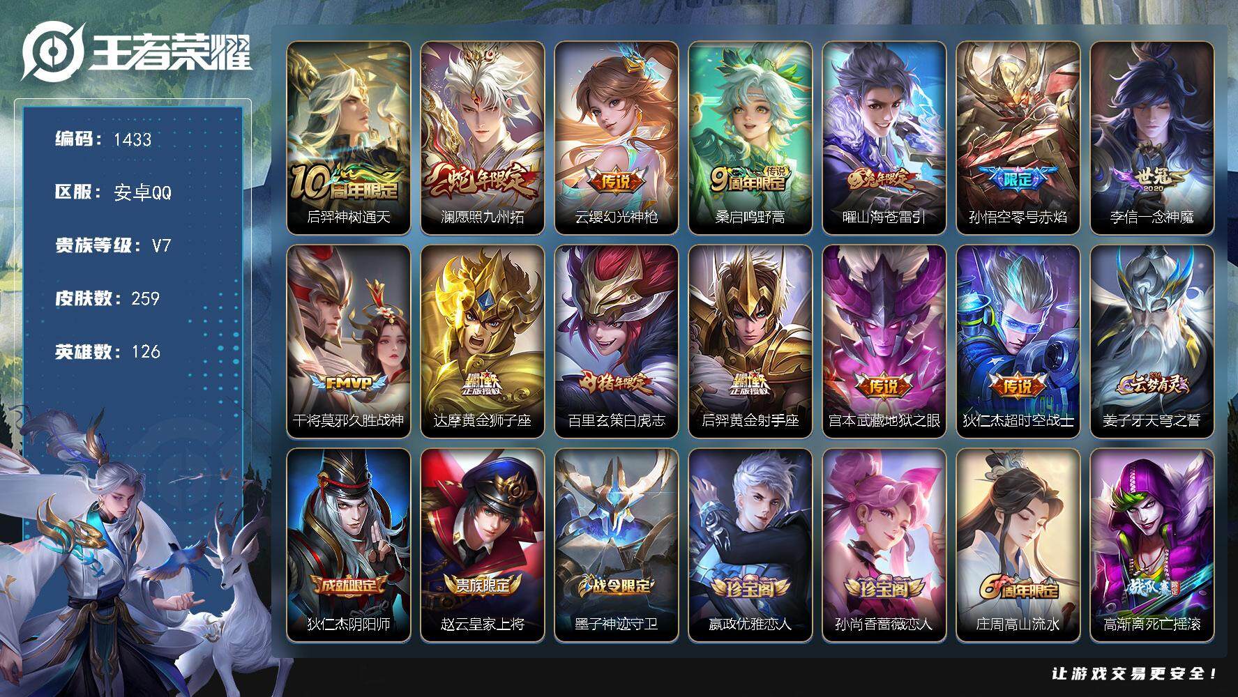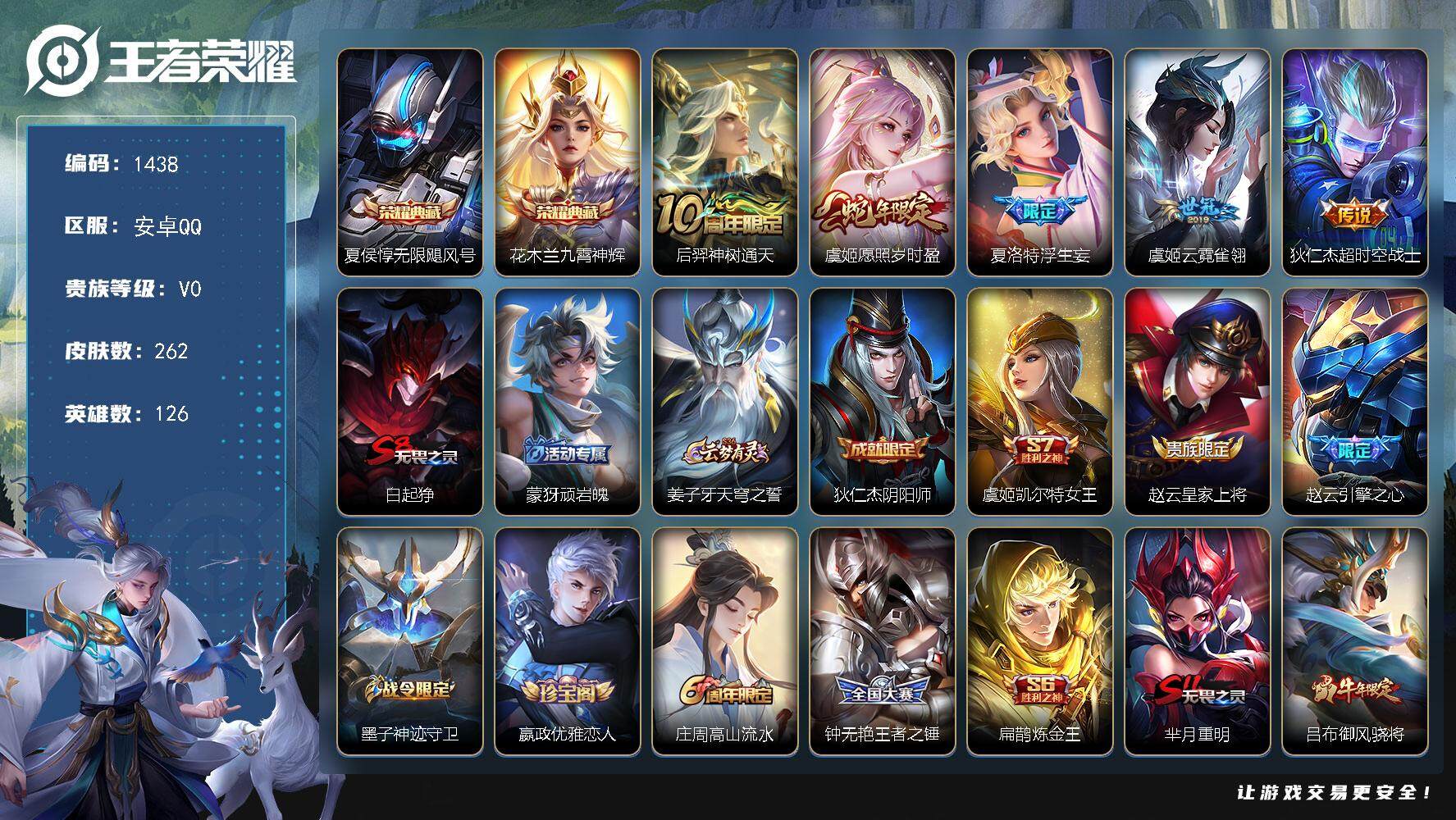 皮肤262 英雄126 尊贵铂金 荣耀典藏2 传说5 其他皮肤119-【2典藏5传说】安卓Q-V0-尊贵铂金II段位-126英雄-262皮肤-2典藏
