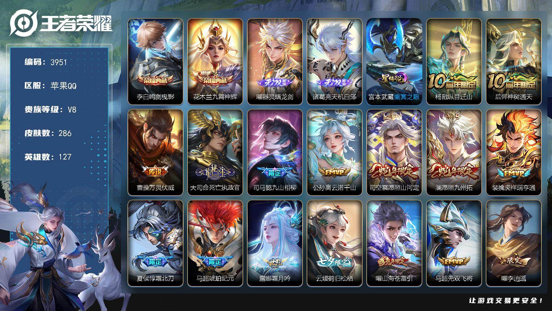 苹果Q-V8-至尊星耀II段位-127英雄-286皮肤-2典藏皮肤-2无双-2