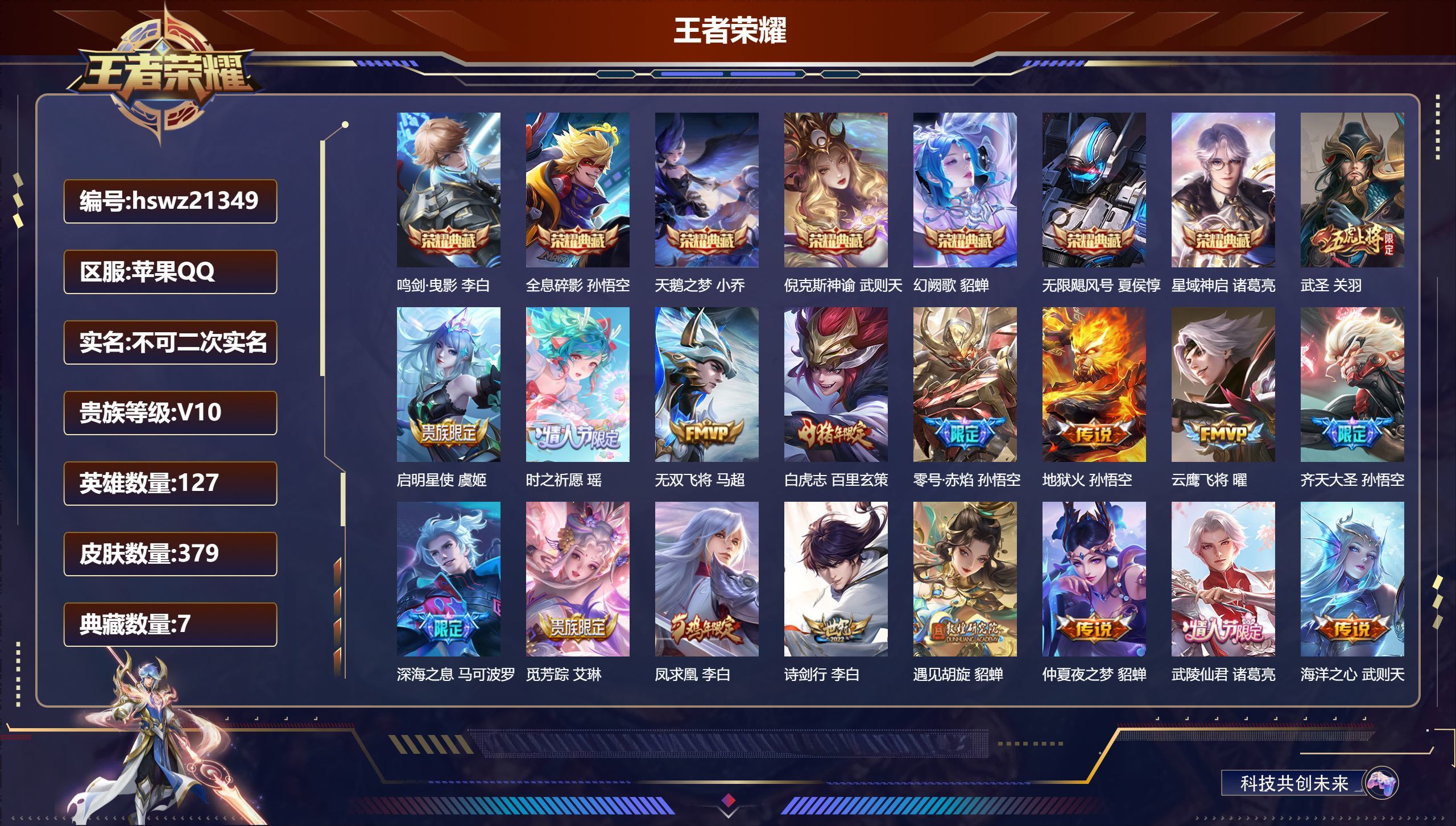 苹果QQ/非凡王者/379皮肤/127英雄/7典藏/0珍品无双/0无双/0珍品传说/34传说/116