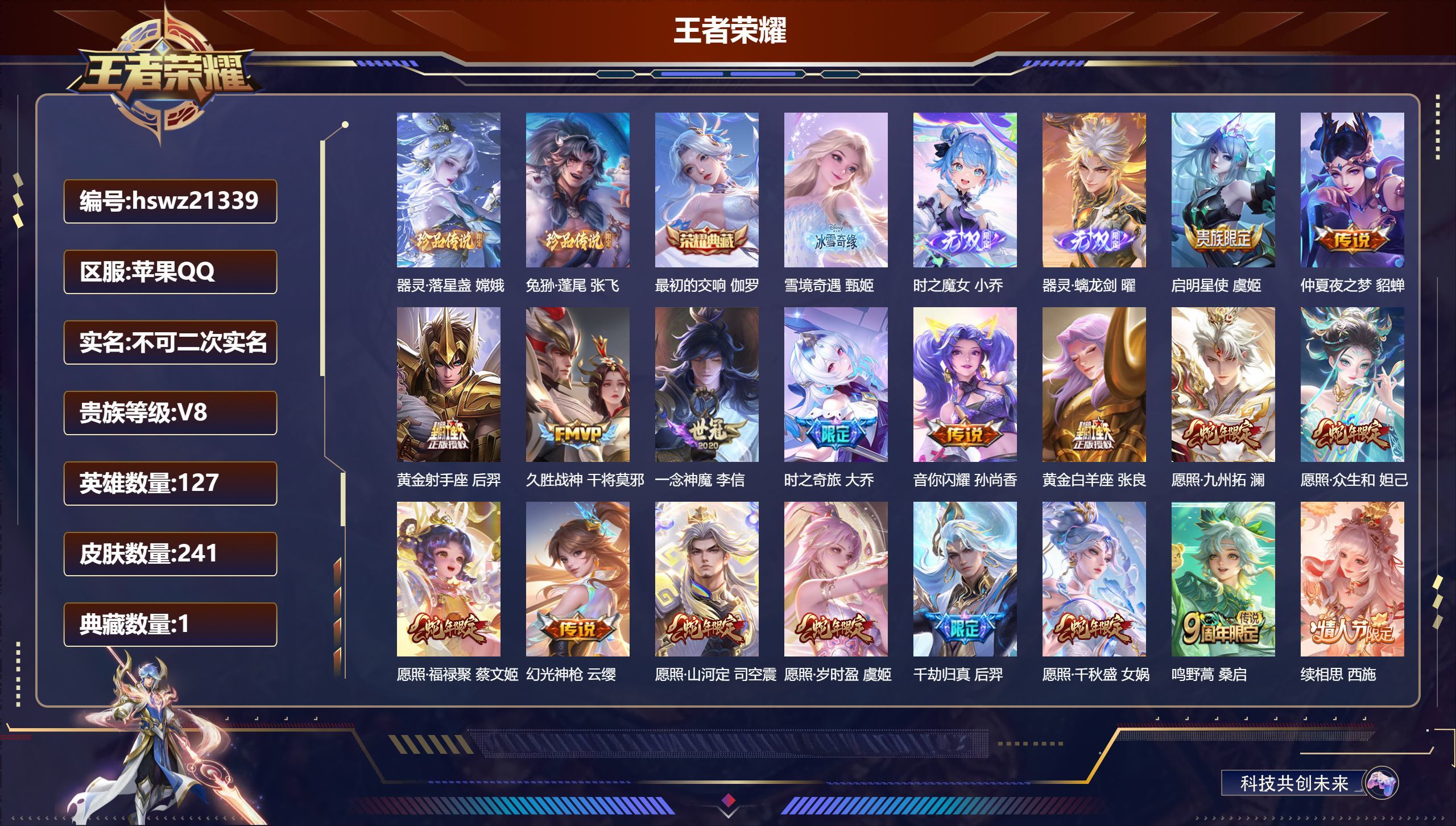 苹果QQ/荣耀王者/241皮肤/127英雄/1典藏/0珍品无双/3无双/2珍品传说/18传说/64史