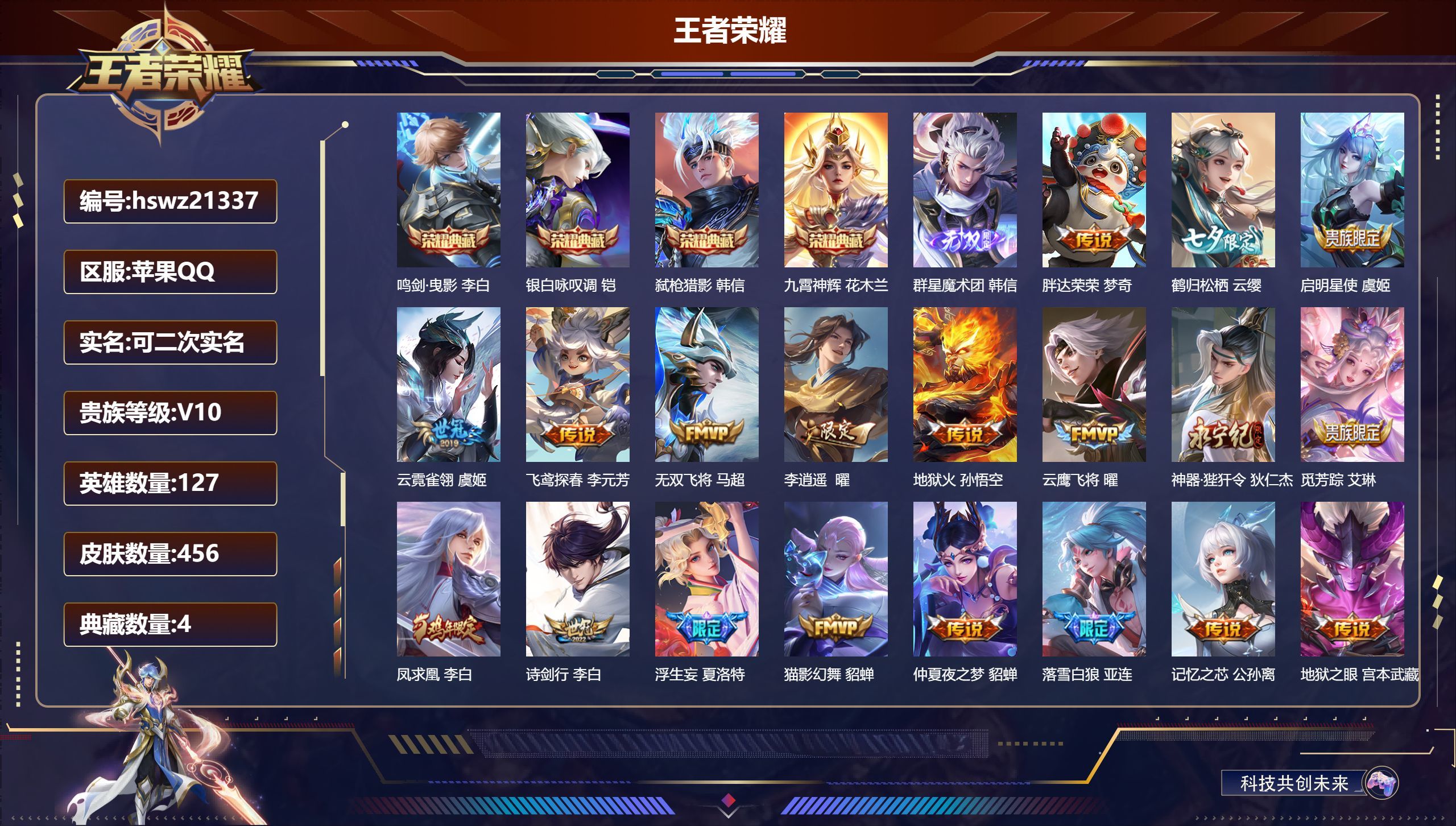 苹果QQ/至圣王者/456皮肤/127英雄/4典藏/0珍品无双/1无双/0珍品传说/44传说/151