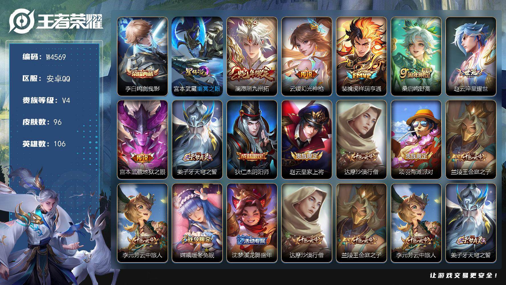 【W4569】安卓Q区-无二次-贵5-106英雄-96皮肤-1典藏-6传说-2