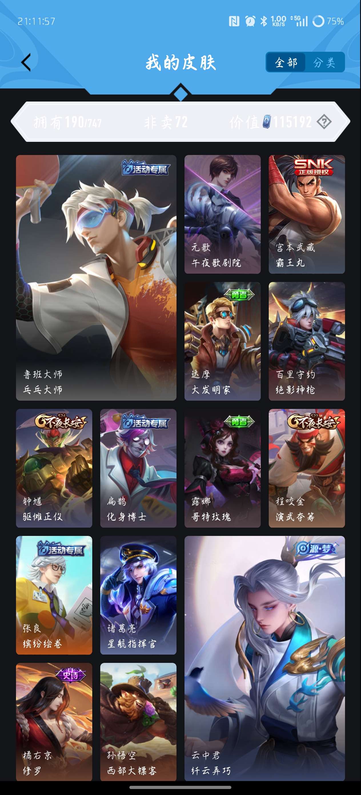 皮肤113 英雄126 至尊星耀 传说5 其他皮肤29-