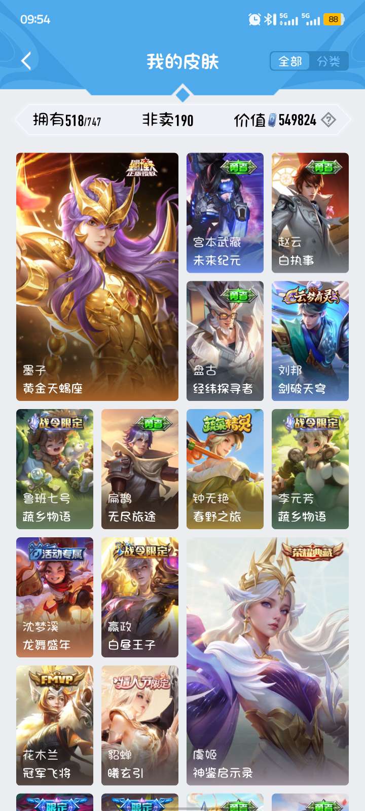皮肤153 英雄124 传奇王者 珍品传说1 传说4 其他皮肤54-可砍价,完全女号瑶妹玉桂狗