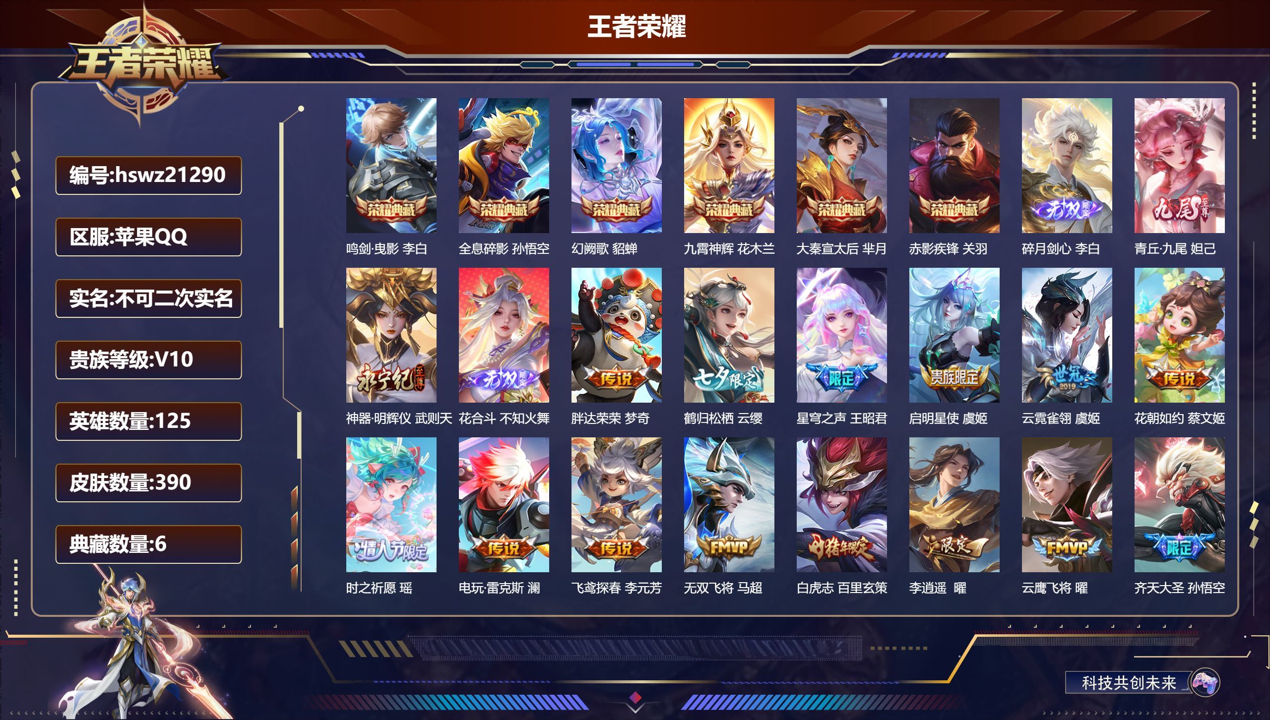 苹果QQ/永恒钻石/390皮肤/125英雄/6典藏/0珍品无双/4无双/0珍品传说/52传说/113