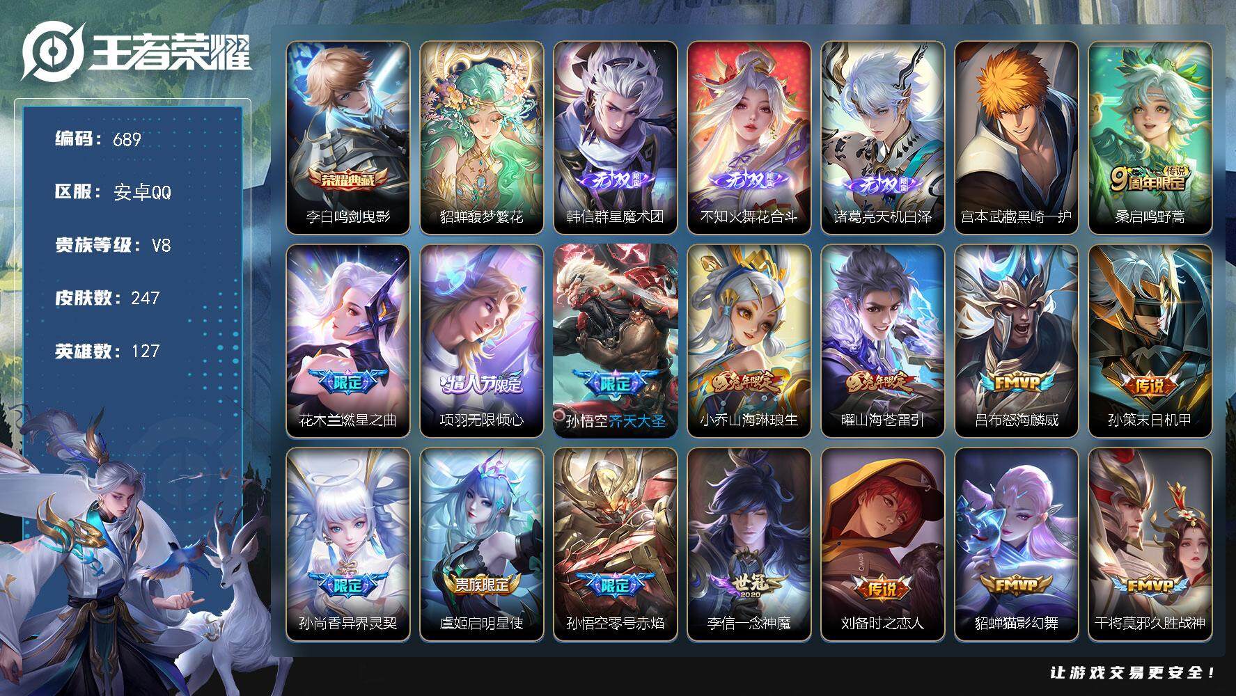 1871199 王者荣耀账号 安卓Q-V8-最强王者段位-127英雄-247皮