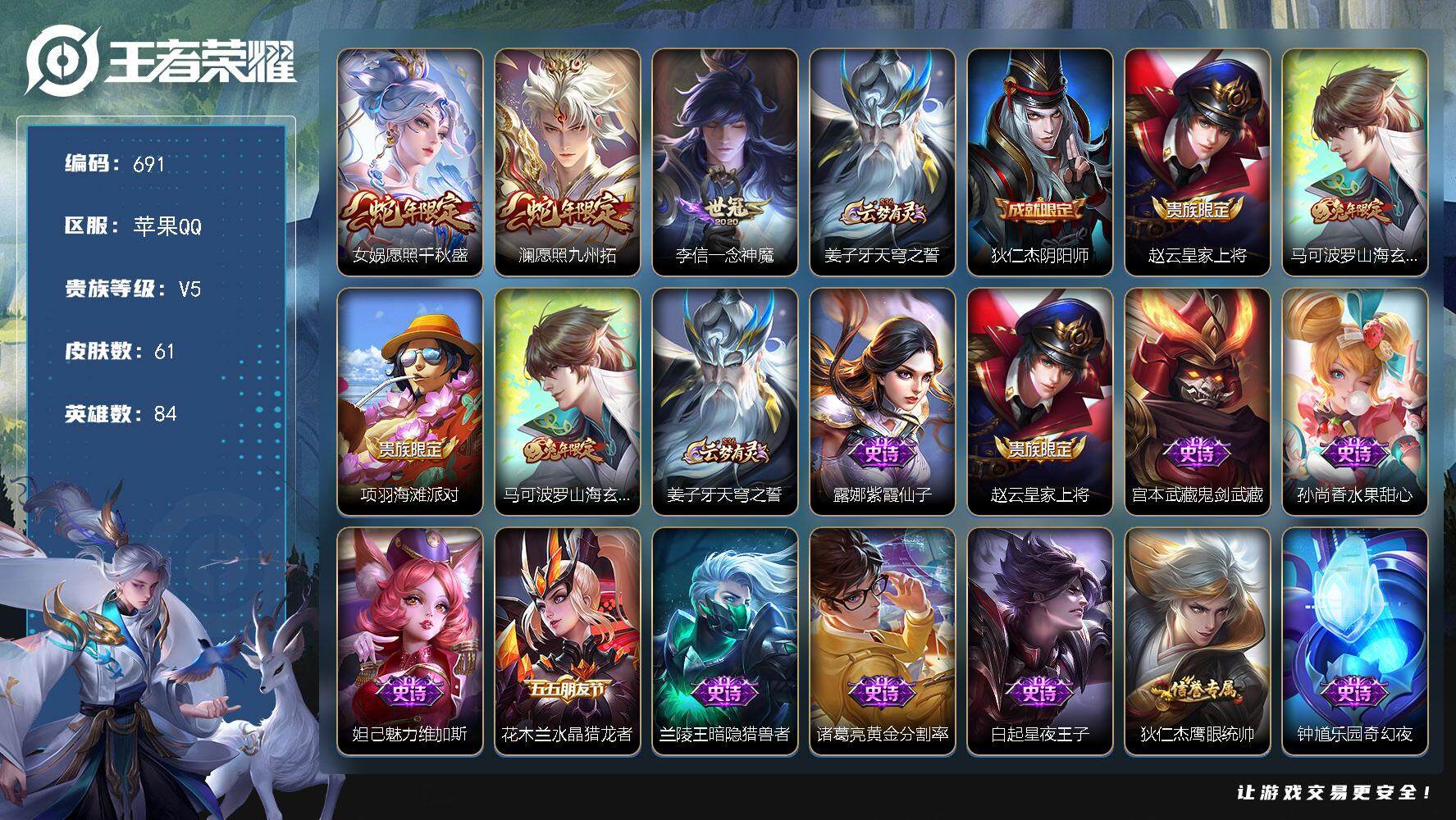 1871212 王者荣耀账号 苹果Q-V5-最强王者段位-84英雄-61皮肤-