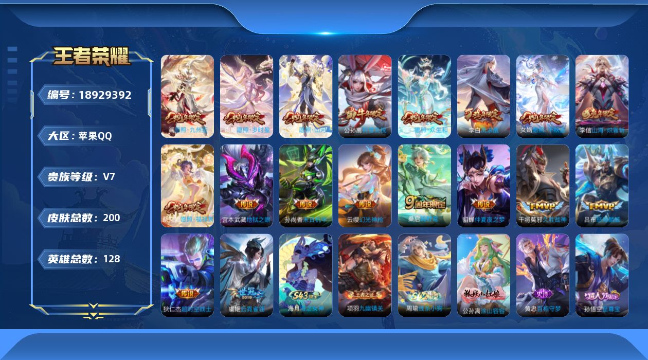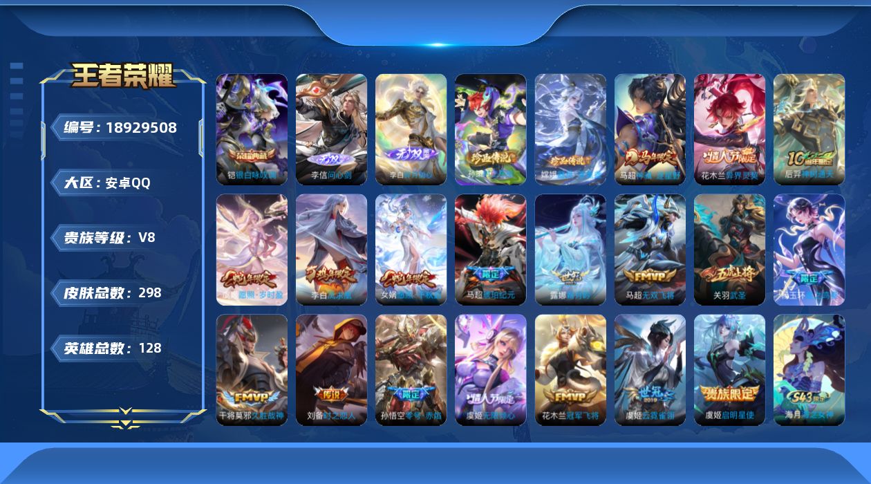 安卓Q-V7-至尊星耀V段位-128英雄-247皮肤-6传说-66史诗【英雄全