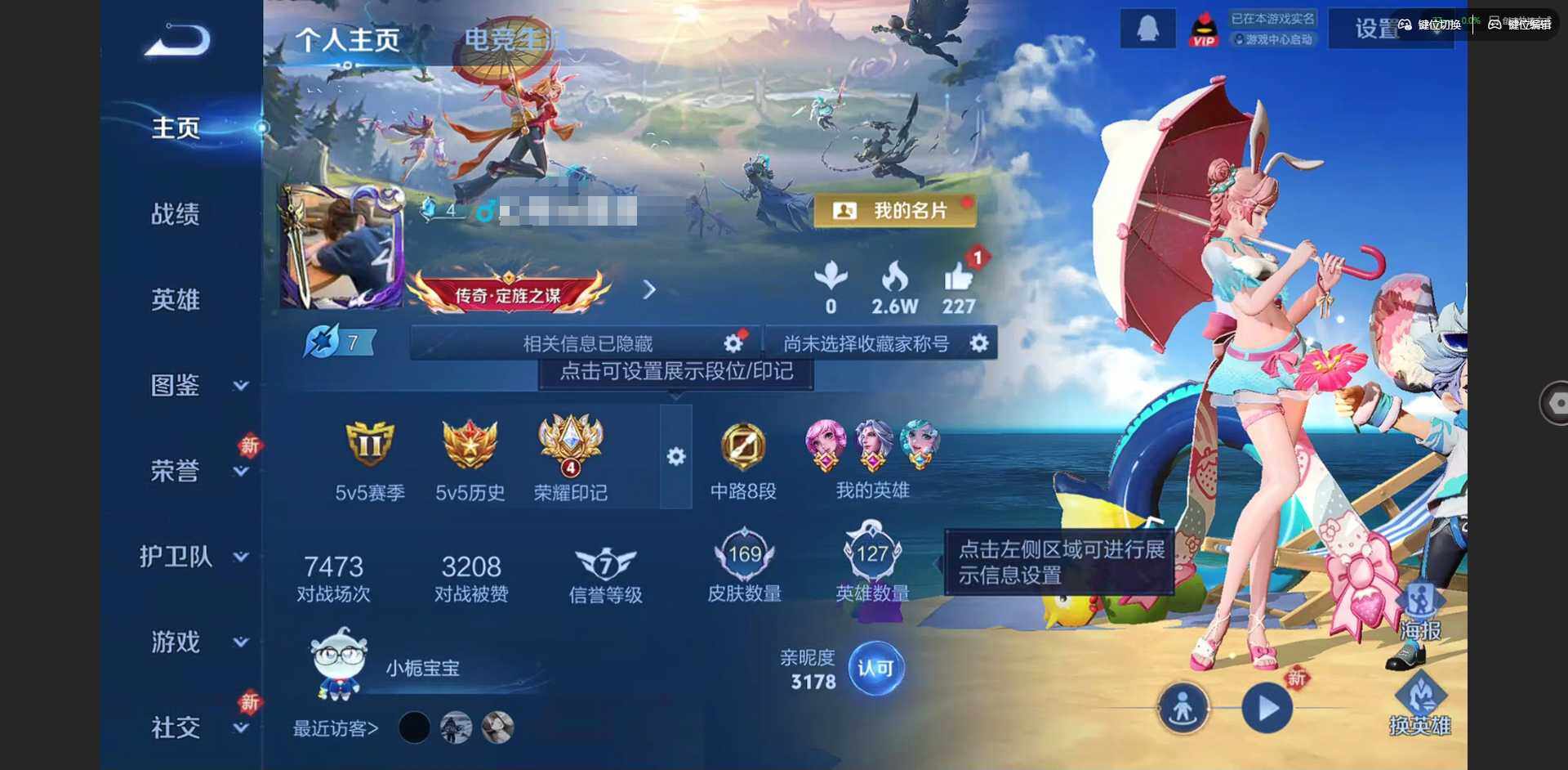 实名: 可修改 贵族等级: V7 英雄数: 127 皮肤数: 169 荣耀水晶: