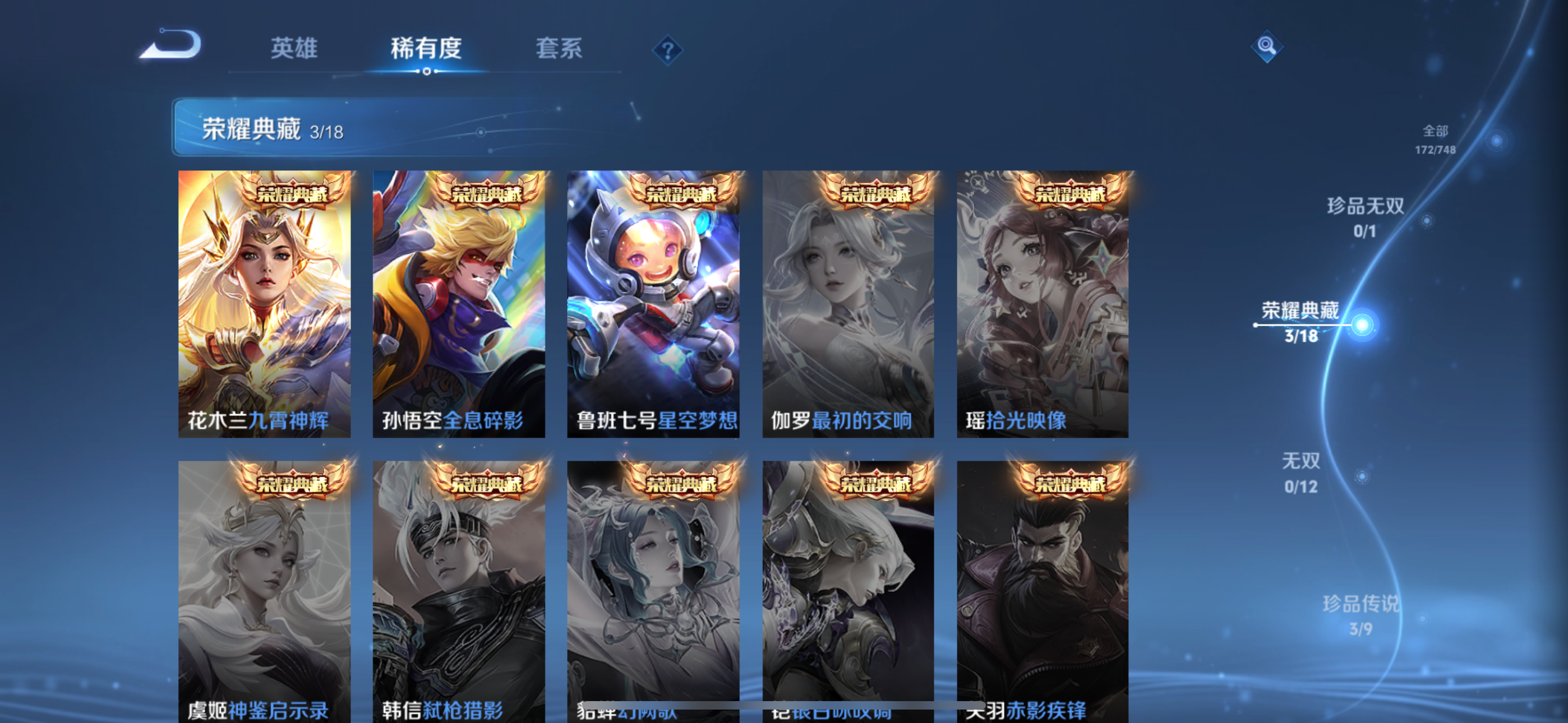 皮肤172 英雄126 无双王者 荣耀典藏3 珍品传说3 传说12 其他皮肤69-3典藏皮肤,3珍品传说