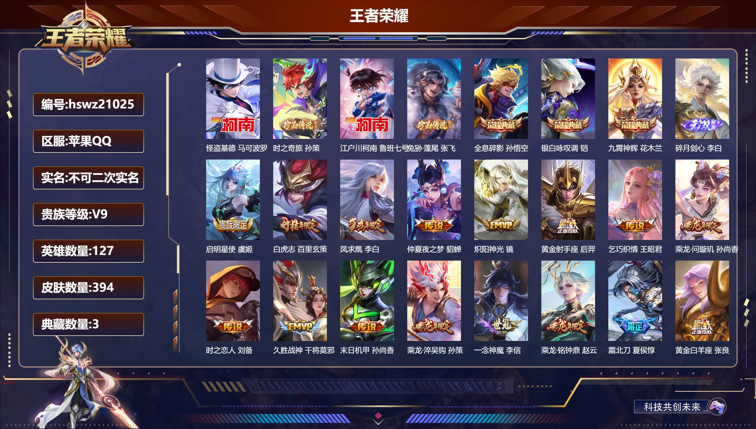 苹果Q-V9-最强王者段位-127英雄-175皮肤-2典藏皮肤-7无双-4珍品