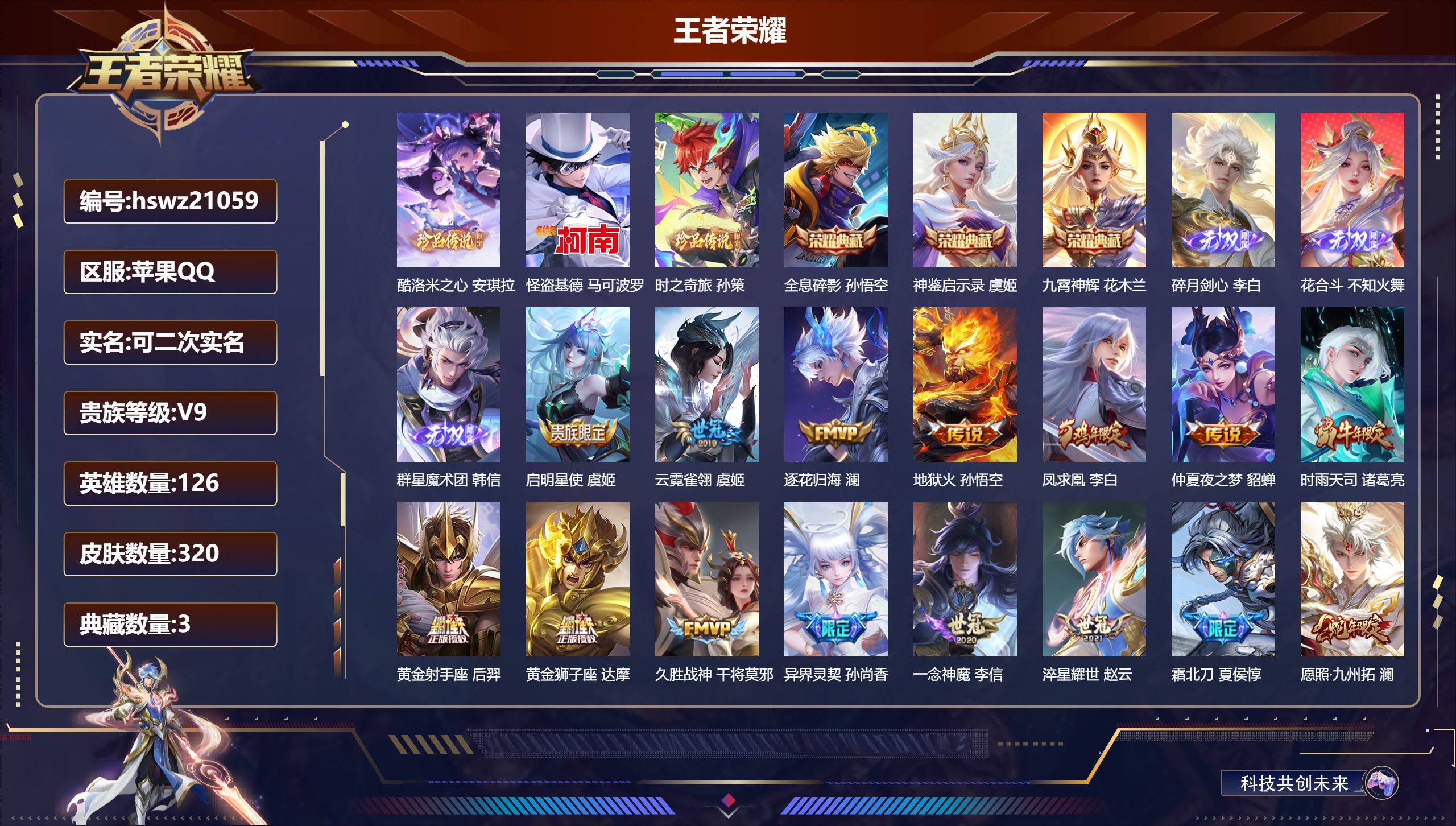 【贵族9】可二次实名/320皮肤/126英雄/3典藏/3无双/3珍品传说/19传说