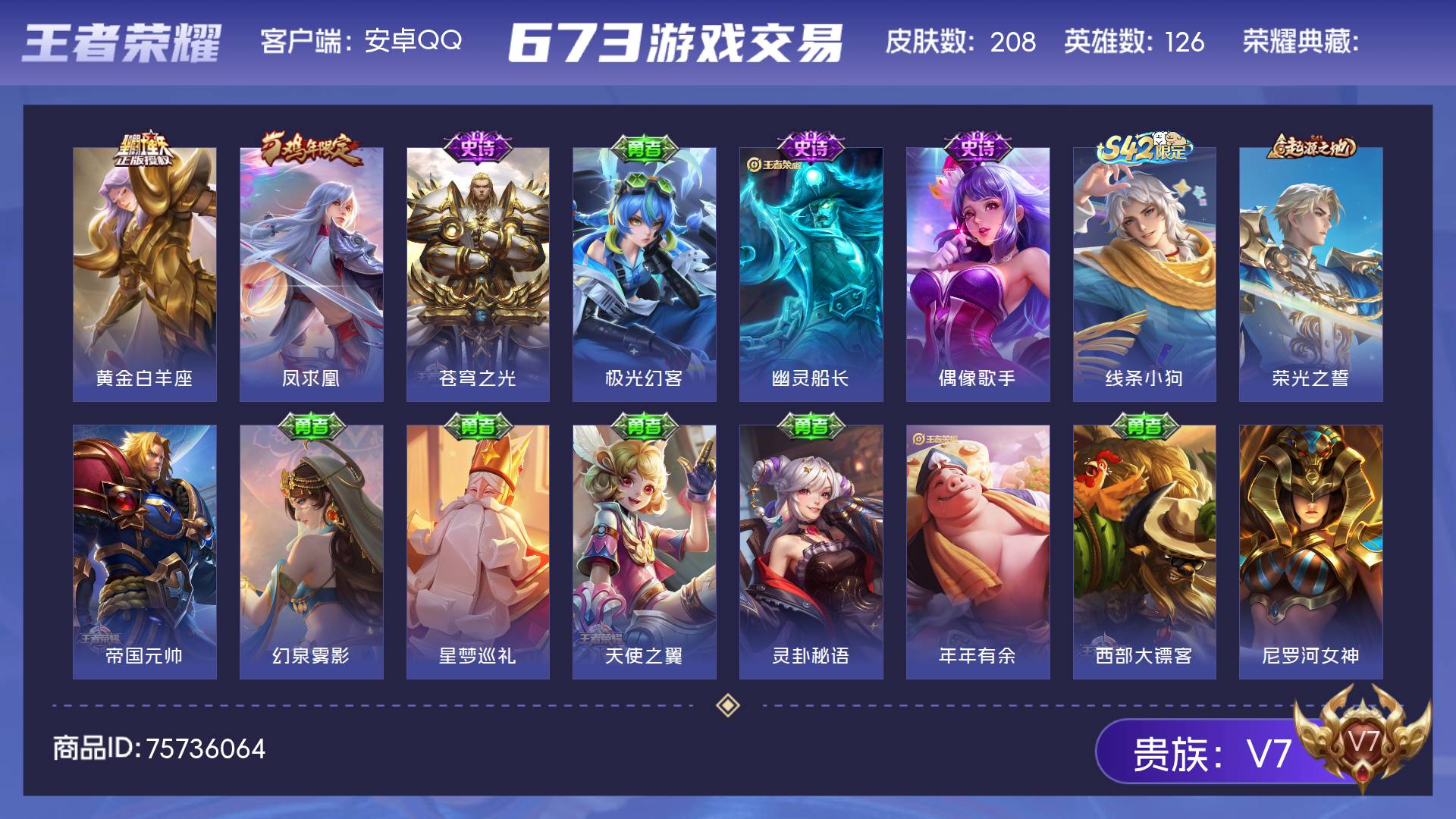 V7 皮肤208 英雄126 无双王者 传说2 其他皮肤211