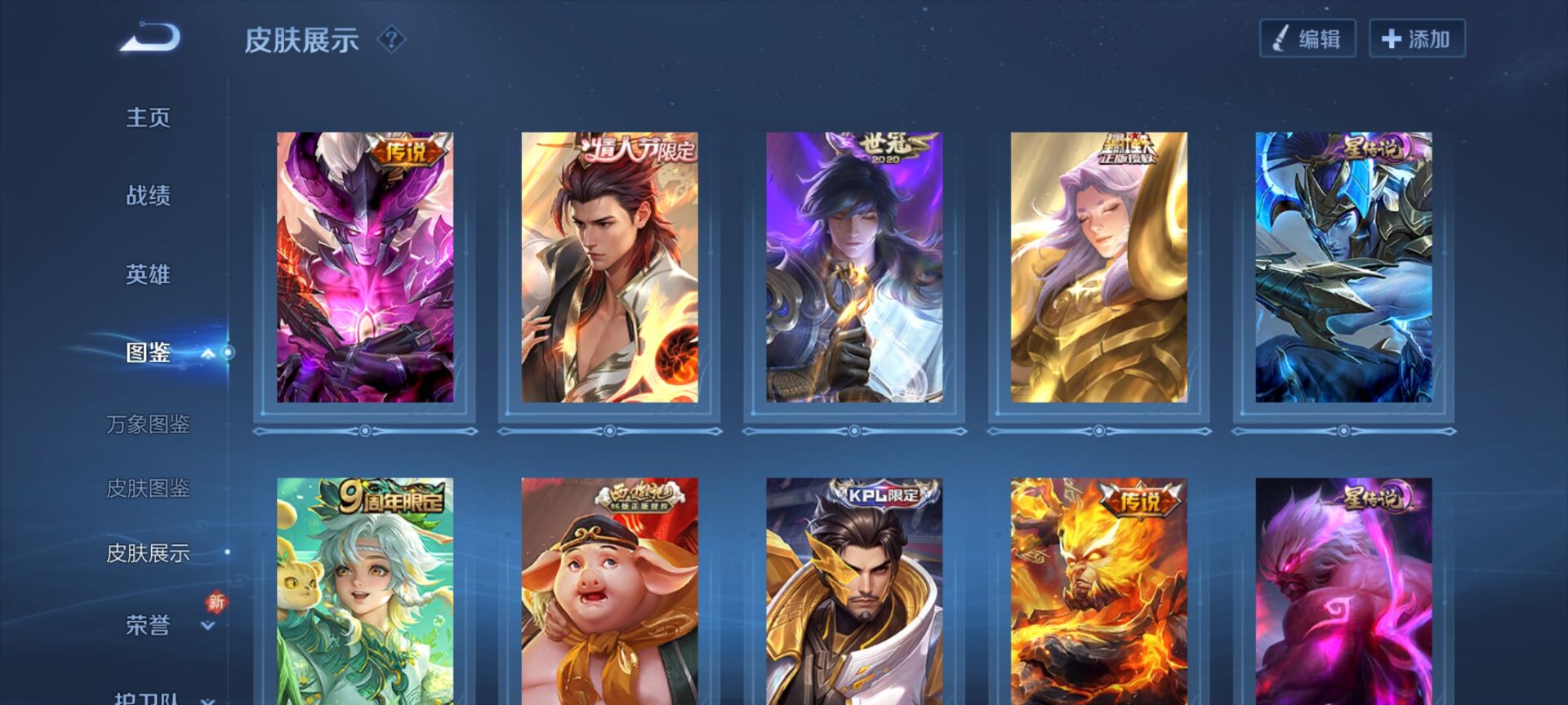 贵族7 荣耀典藏1 珍品传说1 传说皮肤11 史诗皮肤89 皮肤数量337