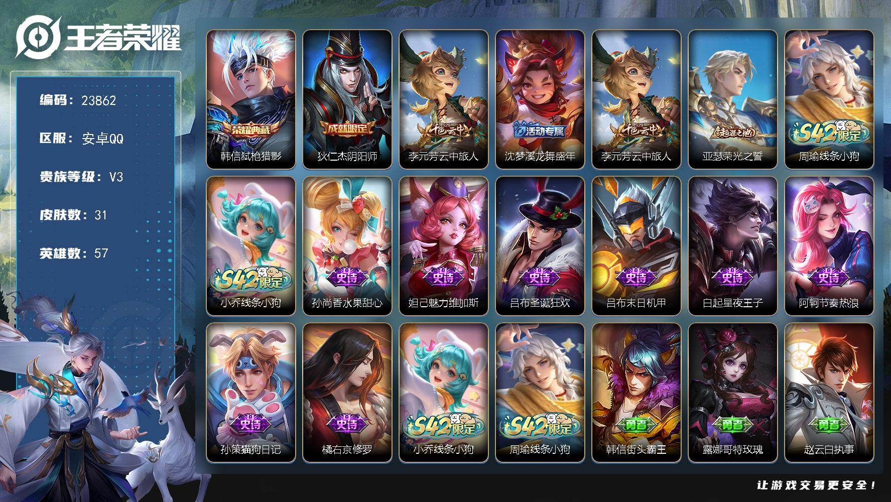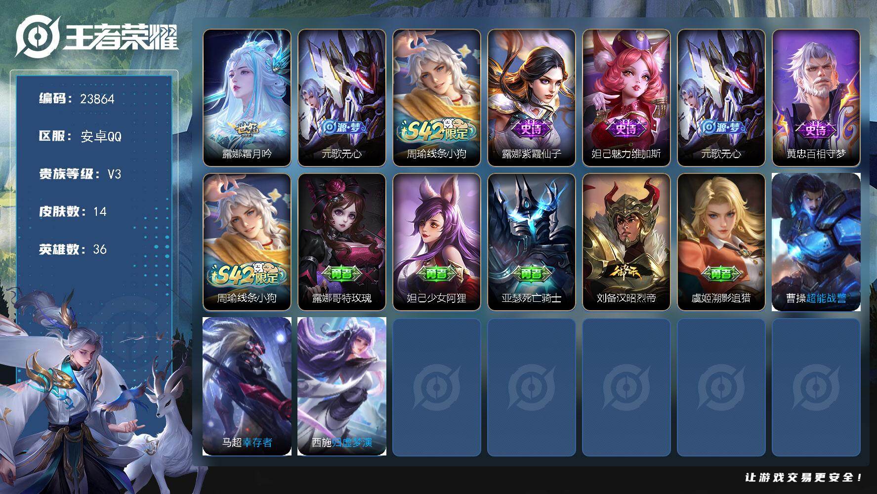 可换绑【店长推荐捡漏高性价比号·诸葛亮小乔无双·虞姬典藏·浮生妄·落雪白狼·影