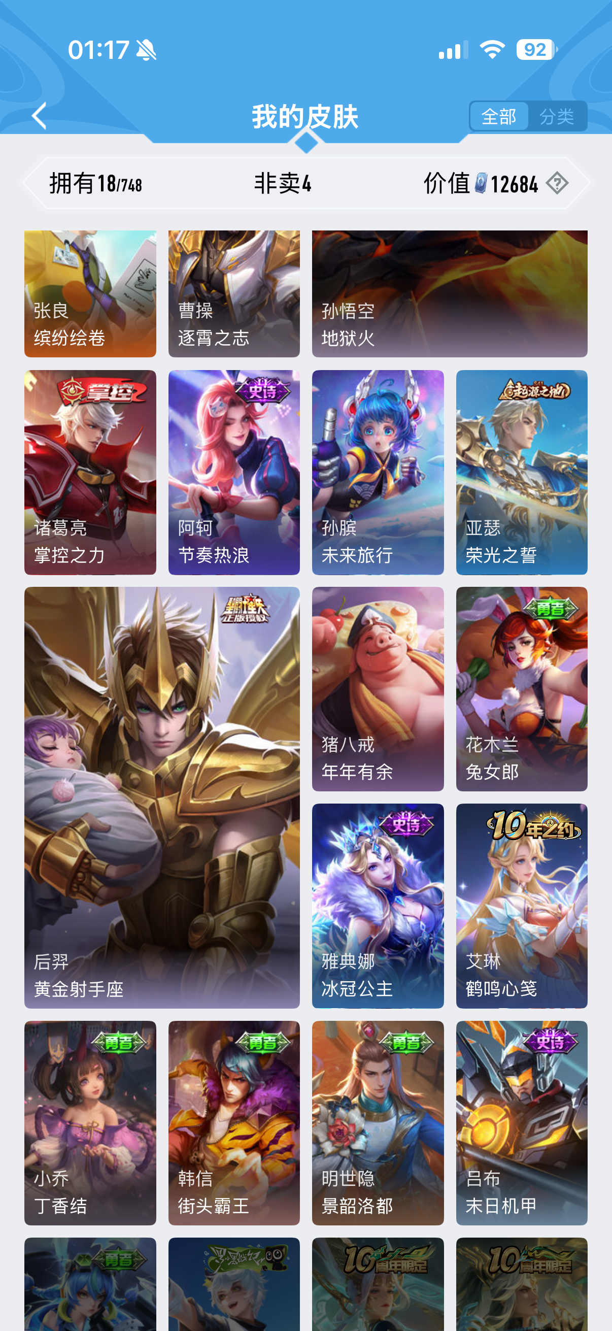 皮肤18 英雄36 至尊星耀 传说2 其他皮肤6-小号看得起的来,价格可议