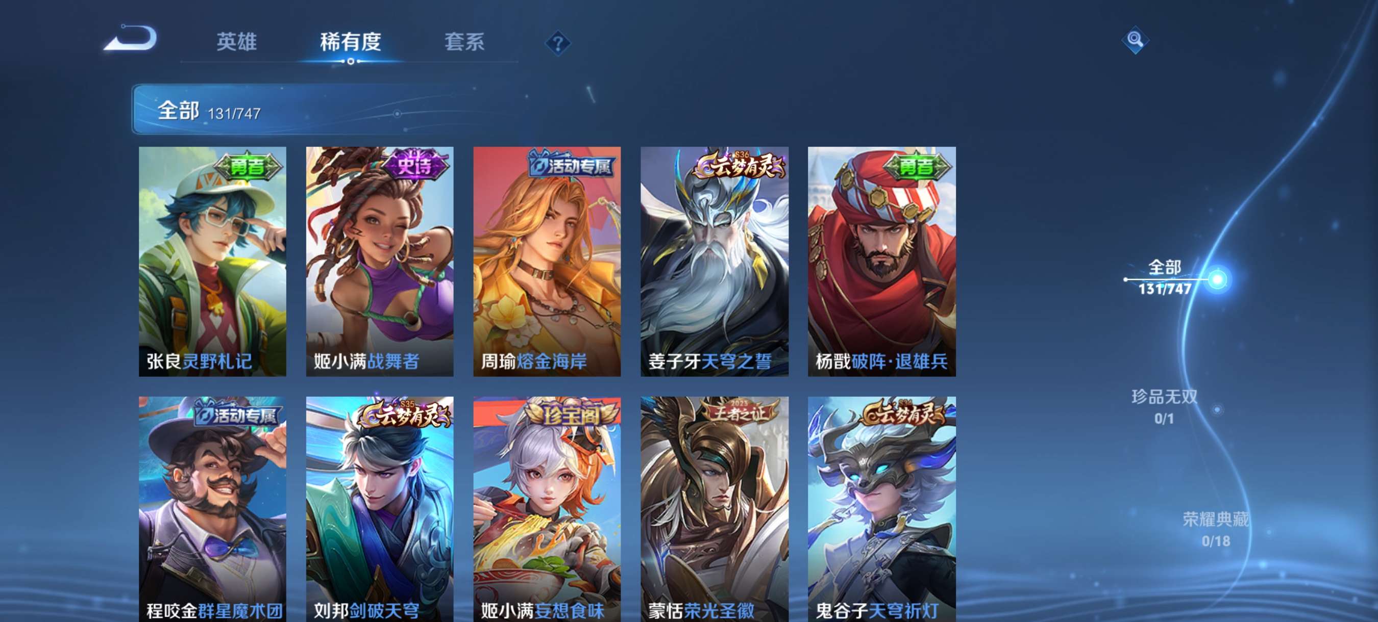 安卓v/绝世王者/160皮肤/118英雄/2典藏/0珍品无双/0无双/1珍品传说/24传说/47史