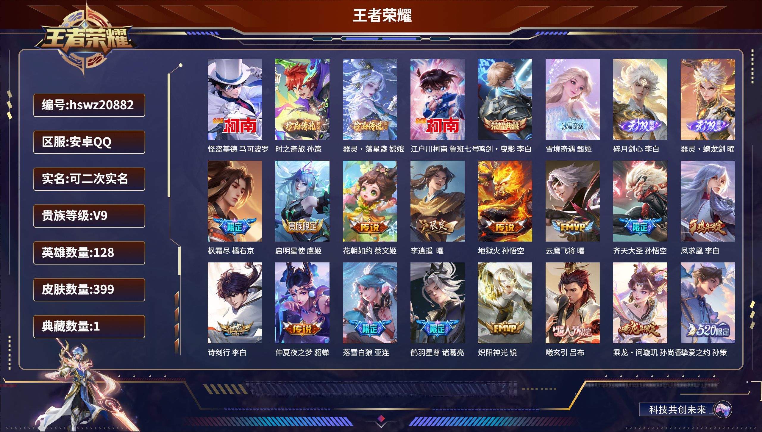 安卓QQ/至圣王者/399皮肤/128英雄/1典藏/1珍品无双/3无双/4珍品传说/38传说/111